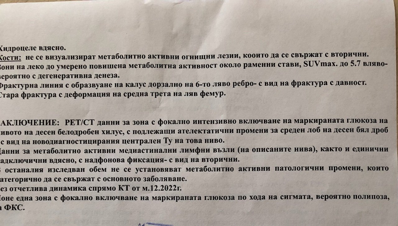Здравейте, излезе пет скенерът на баща ми. Болката в лявото рамо не е свързана с карцинома. Бях при проф. Дудов сутринта и съм съкрушена. Попита ме дали изобщо виждам смисъл да се лекува…. Нямало фа издържи химиотерапия, защото има кардиологични проблеми (високо кръвно, което поддържа с лекарства) и ниско ТСХ (на лечение с тирозол). Препоръча лъчелечение. Срещнах се с доктор Георгиев от Сити, ще направи план за 25 последователни дни лъче на видимите на пет скенера нодули. Но каза, че това на практика не е решение. А и има риск от кръвоизлив на тумора заради лъчето. Смазана съм, все имах някаква надежда…