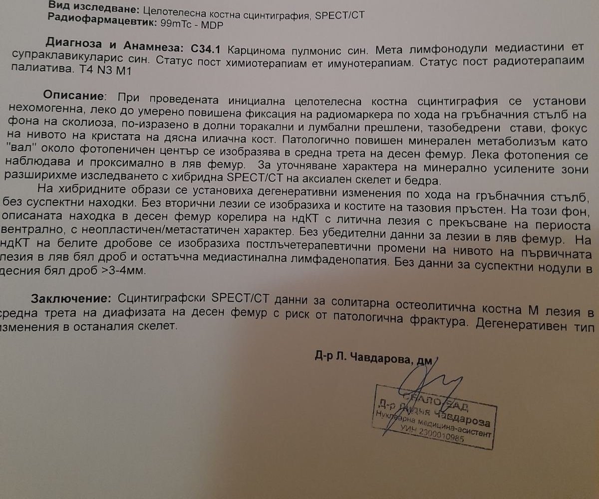 В заключението ясно е написано: Метастаза в десен фемур(бедрената кост ) с висок риск от фрактура. Останалите промени по скелета са дегенеративни.
