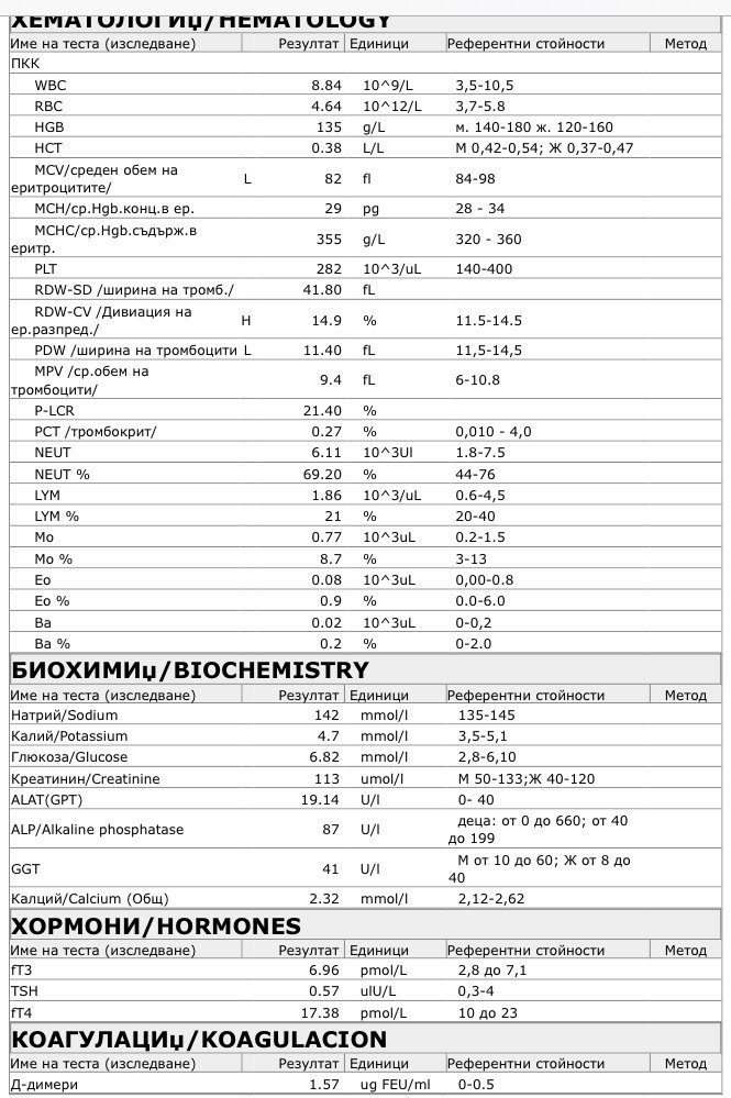 Моят баща днес беше на второ вливане в онкодиспансера в Младост. Избрахме да е амбулаторно, че нали изобщо не иска да остава в болници вече. Не знам какво сме загубили като прегледи и терапия. Прилагам кръвните му изследвания и моля за коментар. Пуснах някои допълнителни показатели - ТСХ вече е над долна граница ( беше почти 0 доскоро). Забравих обаче да искам и билирубин, че много жълт е напоследък, склерите му също, а и очите му сълзят от седмица. Дали има връзка с химиите? Питах доктора дали трябва да пие добавки за анемия, но каза, че не е нужно. За инжекция с Б12 (досега е слагана само преди първата химия) ни каза преди четвърто вливане.