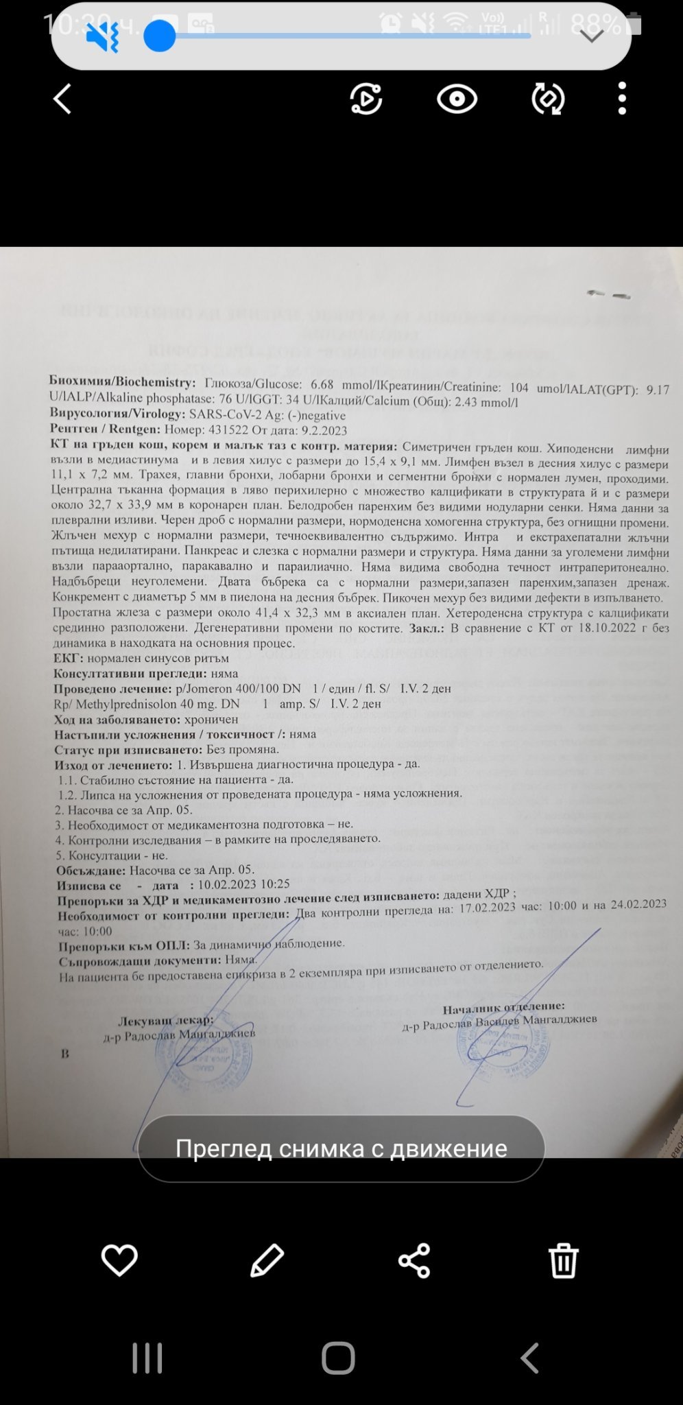 Нека да задам по конкретни въпроси към групата относно скенера на татко . Има ли според вас някакъв шанс за оперативно лечение ,какво означават тези уголемени лимфни възли, както и дали виждате нещо което да говори за пневмонит. Татко имаше пневмонит все още е на лечение с медрол 6мг. Точно заради този медрол някои лекари не искат да рискуват с имунотерапия . Неговия лекар предлага наблюдение и според него няма какво да лекува с имунотерапия ,за която аз настоявам. Доктор Хинков споделя ,че няма пневмонит според този разчет и въпреки това предлага следващата вливка да се направи на този фон от 6мг медрол и после да се спира . И последния въпрос е има ли какво да лекуваме в крайна сметка ,защото аз виждам че тумора си стои там . Това за мен означава че има....помогнете моля с мнение