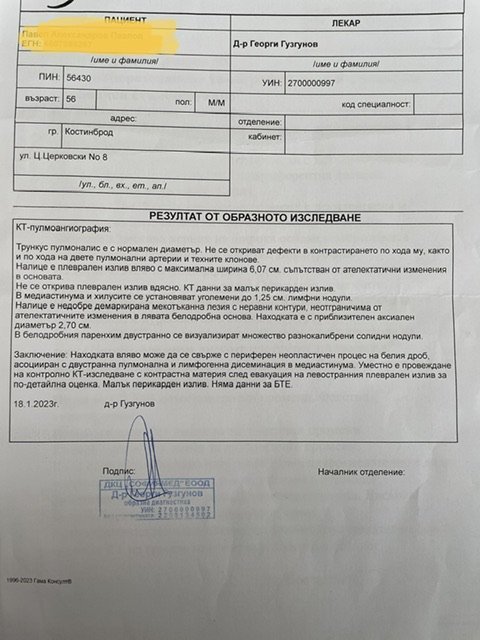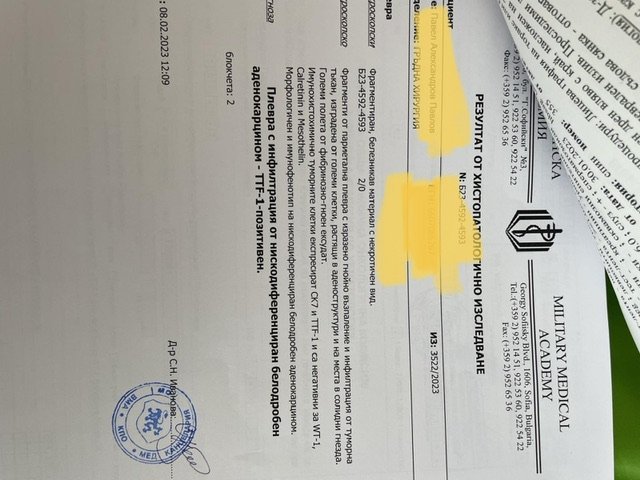За ЯМР на главен мозък още не са ни насочили. Ще се лекува в “Иван Рилски” при д-р Божил Робев. В петък беше при него на консултация и той иска биопсия от лимфен възел( някъде над ключицата). Казал му е че този лимфен възел го притеснява. Утре, ще я вземат тази биопсия, и ще чакаме резултат. А з паротидната жлеза е извадена някъде преди 20 години, но сме изгубили епикризите и хистологиите. Тогава беше доброкачествен тумор.