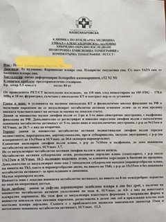На скенера пише,че няма медиастиални или хилусни засегнати. Но при стадирането пише Т2N2M0, на диска се виждат два близки ЛВ, вероятно засегнати. Описанието  е доста подробно и вкл. коремни органи-чисто е . За ЯМР , никой не отваря и дума все още.