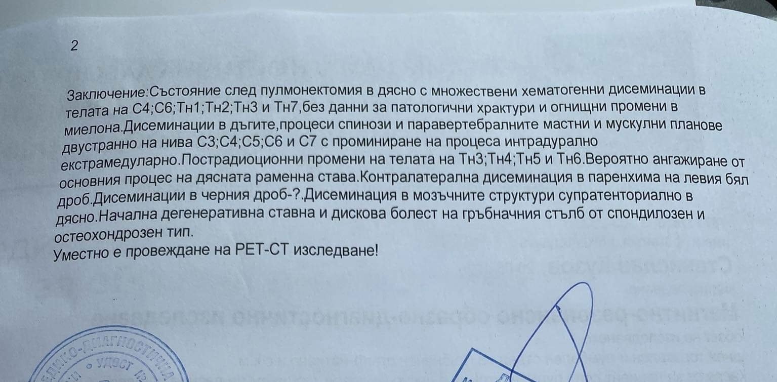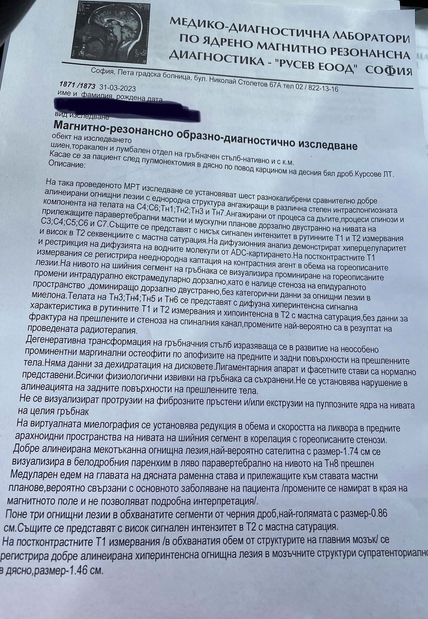Сега за съжаление се установява сериозна прогресия. След постепенно засилващи се болки след лъчетерапията в областта на врат, гръб и рамене, обиколки при Минчев, който каза, че това е нормална последица от процесите след операцията без дори да го прегледа, при невролози и рехабилитатори, на ЯМР вчера се установиха множество лезии по гръбнака, но и в меките тъкани в областта на шията, в другия бял дроб, черния дроб и малкия мозък. Копирам резултата тук. Образните диагностици казват, че много са закъснели. Консултация с Мангалджиев ще имат следващата седмица, т.к. тази седмица не е на работа, но ги е насочил днес да им дадат обезболяващи.