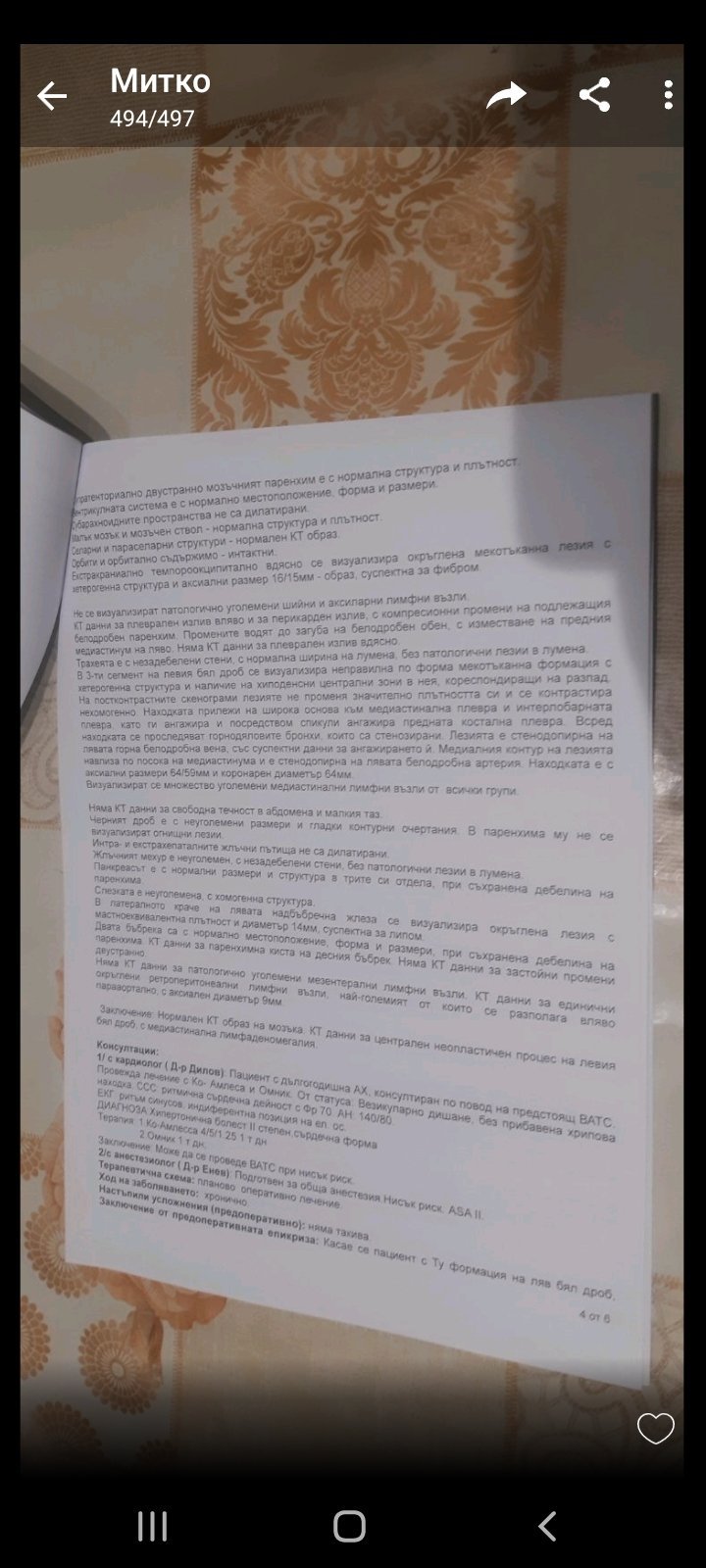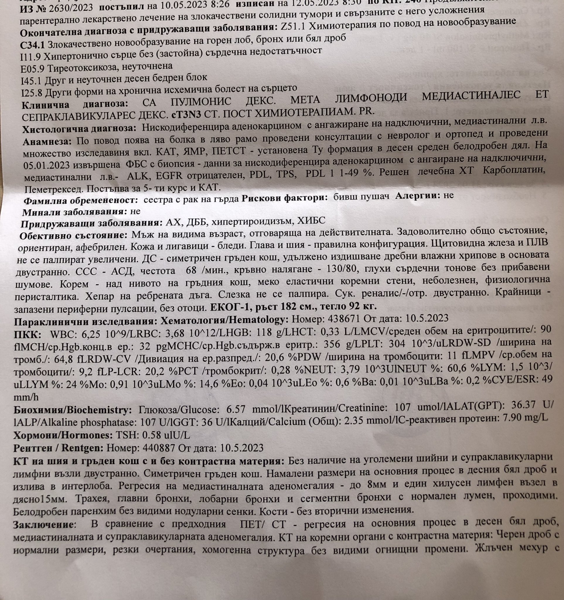 Здравейте, чак сега ви намирам. Естествено не можах да изчета всичко. Става въпрос за баща ми. При случайни изследвания юли месец му откриха образование в белия дроб. Няма да коментирам, неизлекувана пневмония, фиброзно образование и съмнение за туберкулоза. От Добрич сме. Така спешно ни уредиха при доц. Минчев. Веднага отсече рак на бял дроб. Следва биопсия, едно туморно образование подходящо за премахване с робот. Капсуловано , на биопсията излезе начална плоско степенна метаплазия без дисплазия. На скенер преди операция имаше два увеличени лимфни възли в близост до тумора. На операцията тумора е ниско деференциран плоскоклетъчен карцином. Без метастази в лимфите, въпреки уголемяването им. Тумора е 4-4.5-3 см. Следва превантивна химия 4 курса. Нямам в момента с какво. Минчев ни прати във Варна при Калев. Той определи химията и я правихме тук. Следва 5 скенер където има граничен л. В. До разреза с рамер 10 мм. , пише реактивен за проследяване. И Минчев и Калев казват от че е от талка при операцията. И двамата са против повече химии. Пропуснах да отбележа , че баща ми е сърдечно болен, с сърдечна и белодробна недостатъчност, с операция на сърце, няколко стенда и непрекъснато проследяван, на 69 години. При химиите кръвните му показатели не се промениха въобще, отлични са. Но тоя л.в. Ме притеснява. Какво да следя? И въобще съвети. Благодаря предварително.