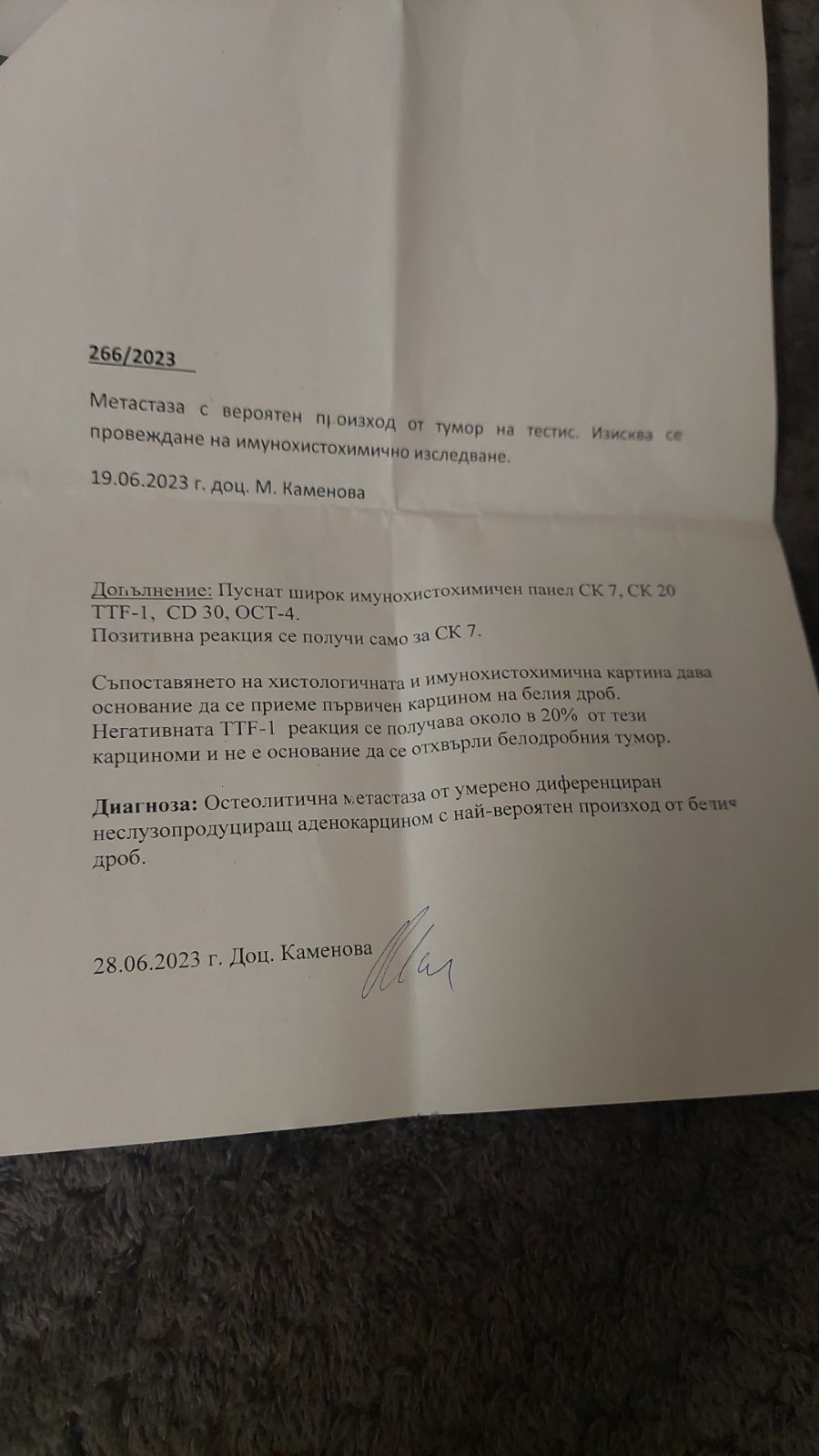 Здравейте от доста време търся информация свързана с темата, но нищо не разбирам! За съжеление преди седмица откриха диагнозата на моя дядо Първичен Канцром на белия дроб с местази в рамото  , които пък идвал от тестисите! Така всичко започна преди 4/5 месеца с болки в рамото, след дълго лутане по специалисти който казваха нищо ти няма се отиде на ядрено магнитен резонанс и там се откри тумор в рамото, отидохме за лечение в Горна Баня болница по ортопедия при др Патриков! Направиха му биопсия и др иследвания чакахме месец и полвина и накрая ни казаха диагнозата като се ходи и на допълнителни иследвания в Пирогов ! Та икам да попитам ако има хора сблъквали  се с това или техни роднини ако могат да ми помогнат😔!  На диагнозата пише Първичен Канциром на белия дроб с метастази в рамото пише, че идва от тестисите и е без усложнения!!! Няма симптоми освен силни болки в рамото, които се засливат през ноща, не кашля храни  се изглежда добре СЛАВА НА БОГА ! Та можели някои да ни каже какво означава тази диагноза, който е по запознат е преминал през това! Коя болница по онкологични заболявания е добра , кой специалист ,какво лечение ви назначиха,кой препоръчвате като цяло защото имам чуството, че е едно безкрайно лутане из болници и иследвания даване на пари без никой да обръща внимание и чакане когато времето е критично!  😔