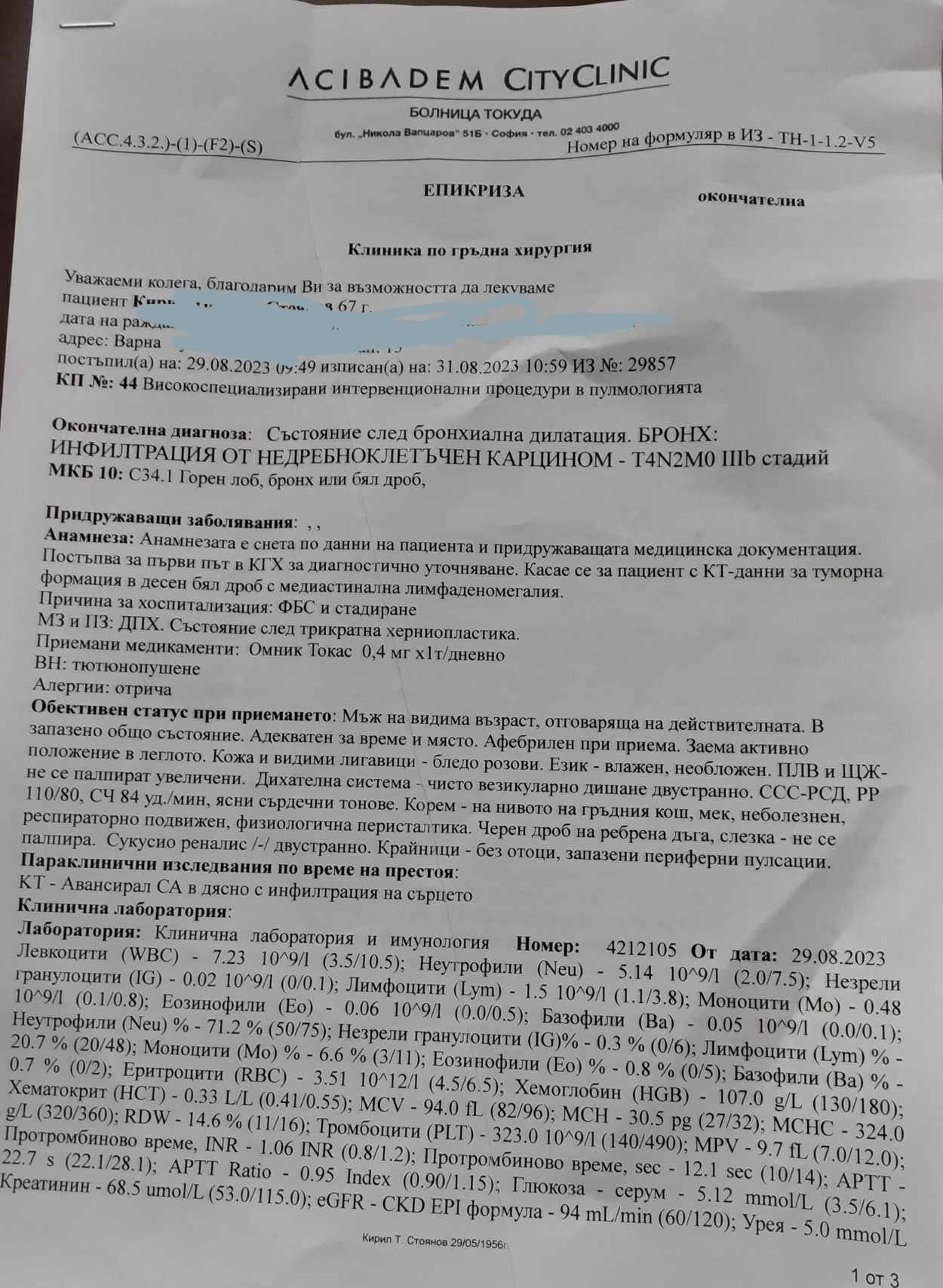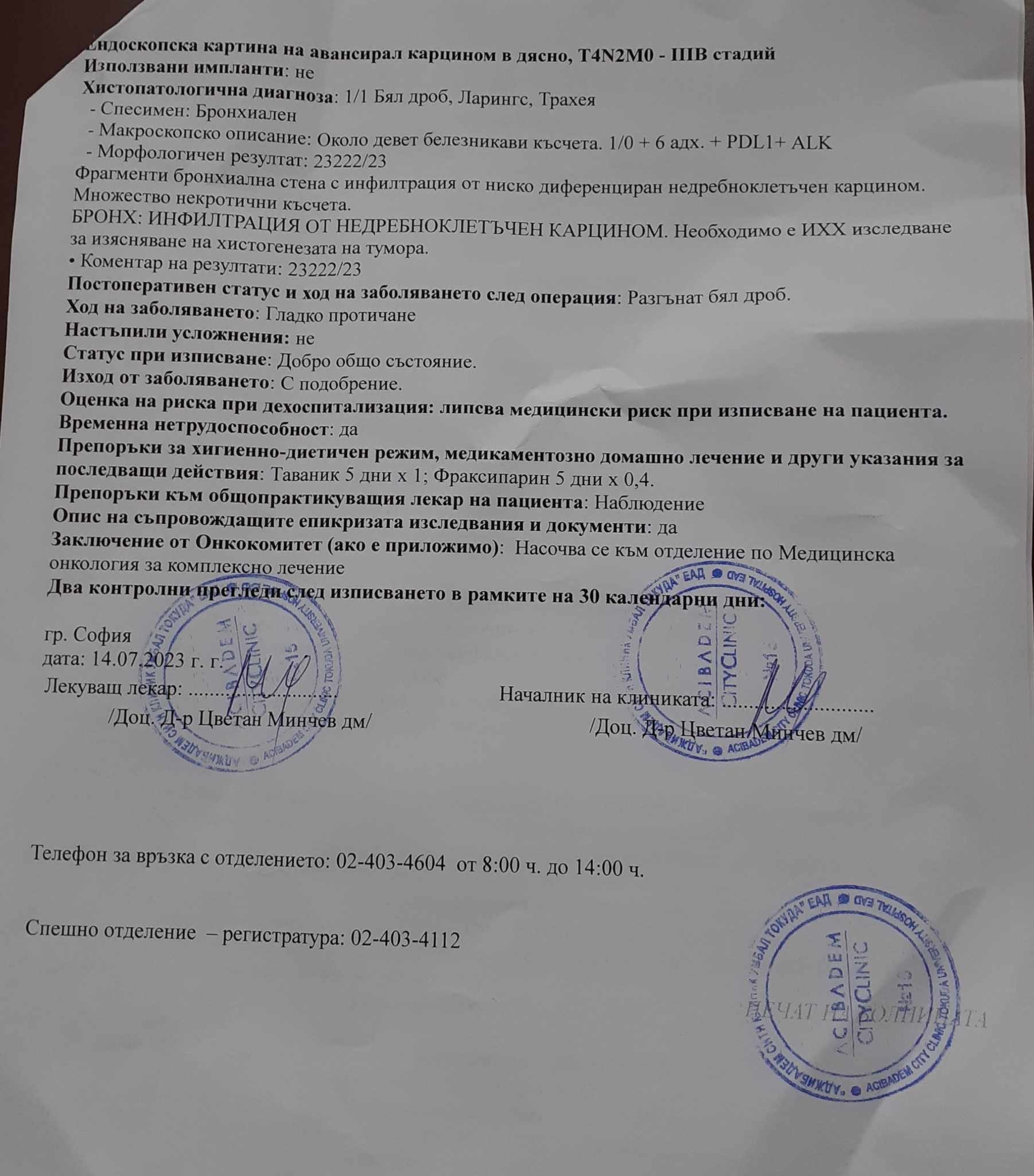 На тринадесети февруари тази година след направен ЯМР на глава на партньора ми се видяха множество метастази в малък мозък. Три от тях големи и на различни места. Двама неврохирурга предлагаха операция за двете разсейки и след месец третата. Неврохирурзи от Иван Рилски успяха с две операции на един път да премахнат и трите. Подадоха ми и предварително резултатите от хистологията и ни насочиха към Димчо Георгиев. Там направихме и скенер с контраст на бял дроб. Също там занесохме и блокчетата за допълнителни изследвания.
