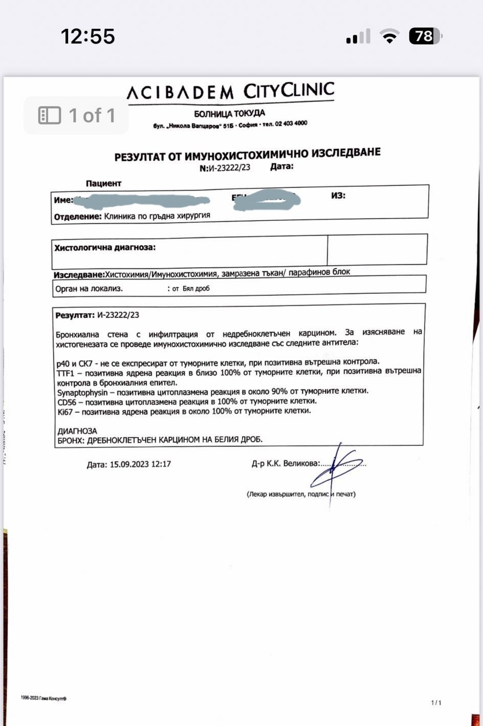 Здравейте, на всички! От както разбрахме, че баща ми е с рак на белия дроб ви чета и съпреживявам с вас,както и да черпя сили ,позитивизъм , знания и надежда , които тук са в изобилие.Изчела съм всички теми до тук, но с подобен казус , като нашият, май никъде не се сблъсках, затова реших да пиша.Въпоса ми е възможно ли е ИХХ-та тотално да отхвърли резултатите от хистологията т.е от хистологичното изследване да излезе, че ракът е недребноклетъчен,а в ИХХ да пише, че изследват недребноклетъчен, който всъщност се оказва дребноклетъчен карцином . Това не са ли два напълно различни рака? Толкова ли е лесно да ги объркат при хистологията?! Неразбирам и недоумявам това противоречие и ако някой може да ми разясни случващото се, ще му бъда много благодарна. Прикачвам и двете изследвания за да стане по-ясно и за вас,  откъде всъщност идва това мое чувство ,че тук сякаш нещо не е наред...