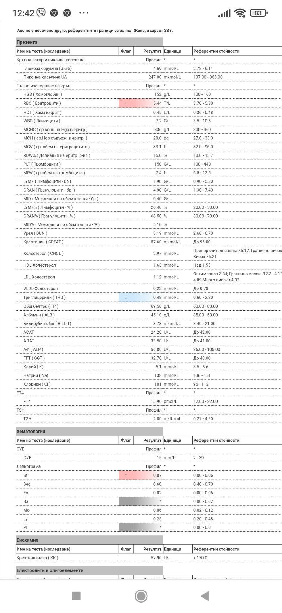 От какво може да се завишат леко еритроцитите и хемоглобина ми е 152...до сега все е бил до 144 максимум ..жената в лабораторията каза,че бил висок за жена,че трябва да е до 140...но пък референтните стойности са до 160...