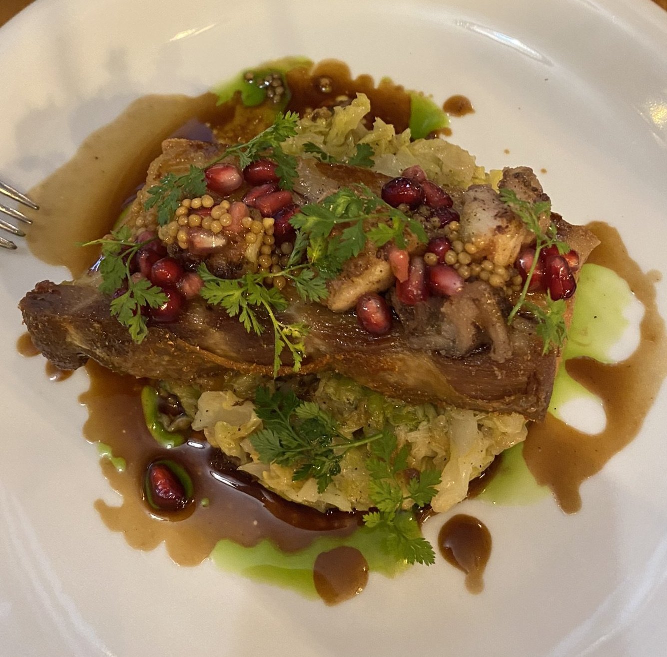 Основно - свински гърди със зеле, 3-4 парченца октопод отгоре за украса, нар и сос