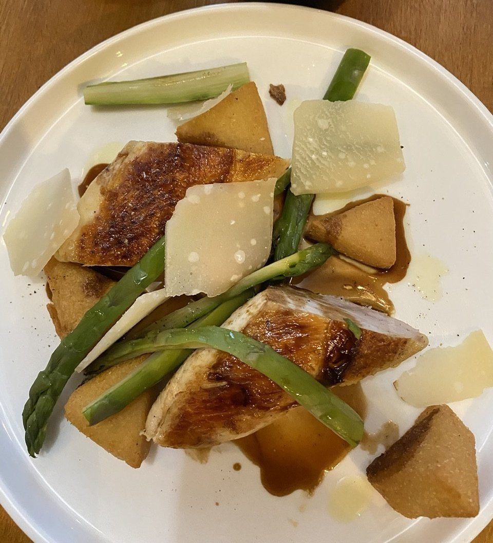 Основно - пилешко с аспержи, крокети, пармезан и сос