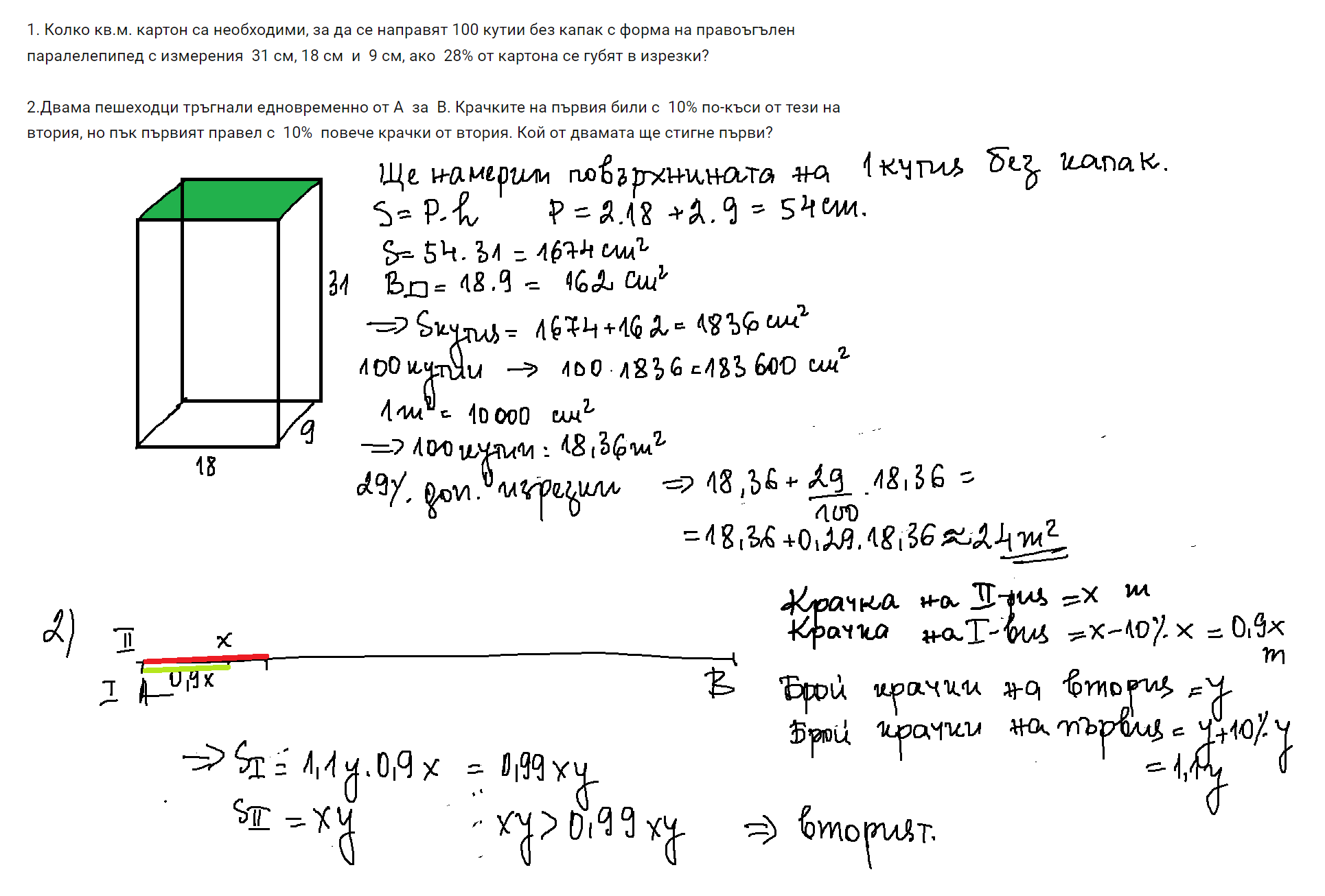 Ама иначе, ако сме прецизни, трябва да се разгледат три случая, в зависимост от това коя стена е основа/капак. Единият вариант е моят (но с 28%), другият е твоят, има и още един. Понеже те са казали просто измерения, ако бяха пояснили с думата съответно, друго щеше да е. Даже имам бегли спомени за някаква такава задача от НВО 7 клас с ламарини.