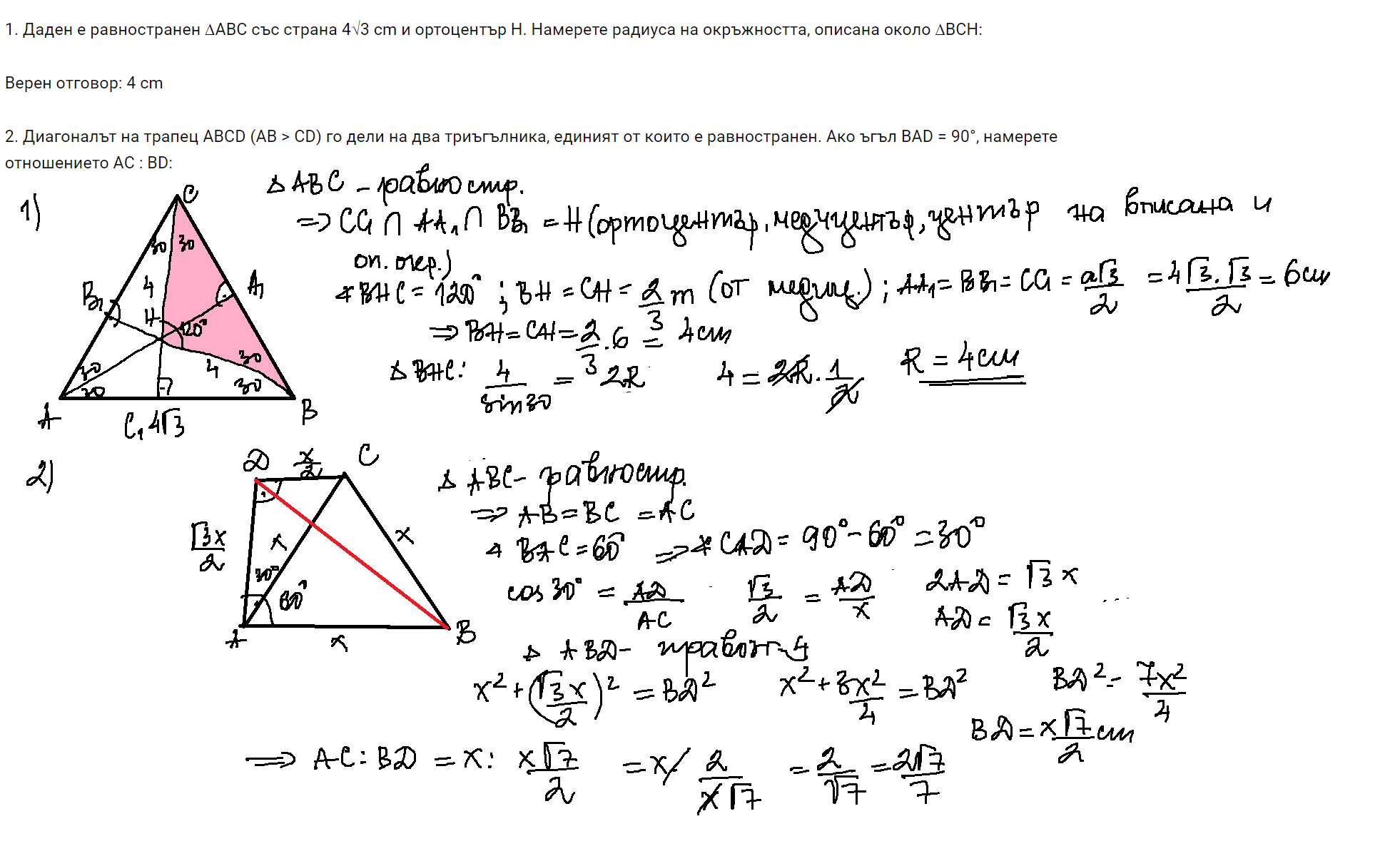 1. Даден е равностранен ∆ABC със страна 4√3 cm и ортоцентър H. Намерете радиуса на окръжността, описана около ∆BCH: