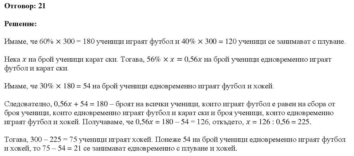 2.В едно училище има 300 ученици, които практикуват по един зимен и един летен спорт. През лятото 60% от тях играят футбол, а останалите 40% се занимават с плуване. През зимата учениците карат ски или играят хокей,  но не и двете едновременно, като 56% от тези, които карат ски, през лятото играят футбол, а 30%  от футболистите през зимата играят хокей. Намерете броя на учениците, които се занимават с плуване и хокей.