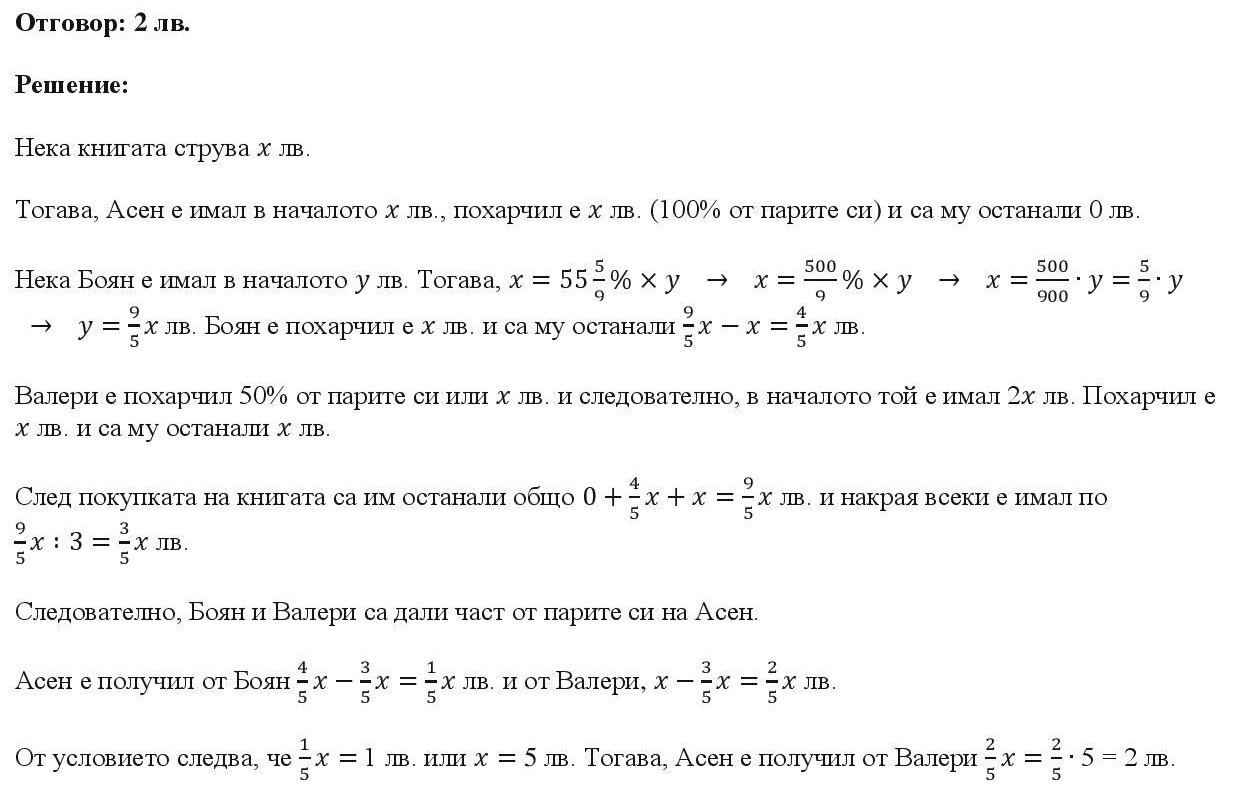 1.Трима ученици Асен, Боян и Валери купили една и съща книга и похарчили съответно 100%,  55 5/9% (55 цяло и 5/9%)  и  50% от парите си. След това те разделили останалите пари по равно, като Асен получил от Боян 1 лв. Каква сума е получил Асен от Валери?