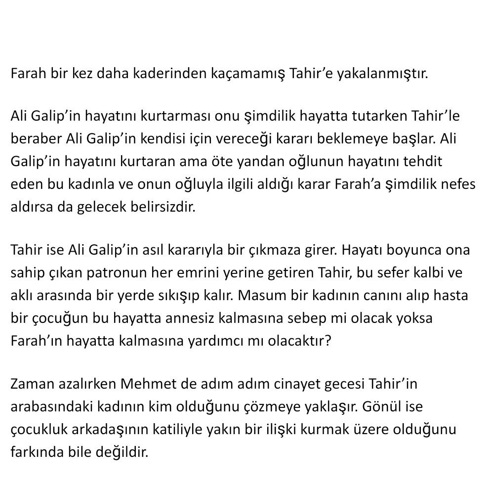 Тахир, от друга страна, е в безизходица заради първоначалното решение на Али Галип. Той, свикнал да изпълнява всички заповеди на шефа, който цял живот се е грижил за него, сега е на кръстопът между сърцето и разума. Ще отнеме ли живота на невинна жена и ще остави ли болно дете без майка в този живот или ще помогне на Фара да оцелее?