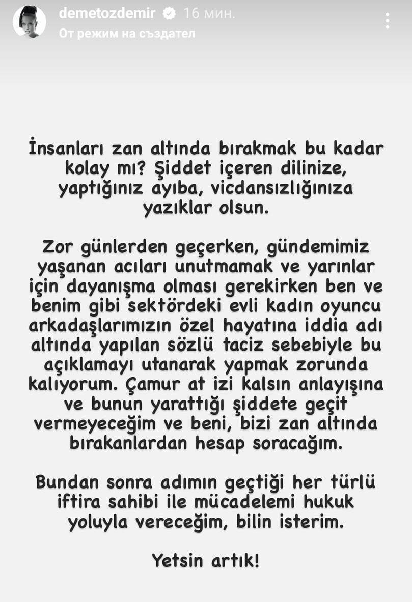 Толкова ли е лесно да заблуждавате хората? Жалко за езика ви на омраза, за срамните ви и безскрупулни действия. Докато преминаваме през трудни времена, в които не трябва да забравяме страданието и да бъдем солидарни, се срамувам, че съм принудена да направя подобно изявление поради клеветата, отправена към омъжените жени в сектора ни като мен и колежките ми актриси. Няма да позволява калта да остави следи върху нас и ще държа отговорни, онези които заблуждават хората. Искам да знаете, че оттук нататък ще се обърна към закона относно всякакви клевети, свързвани с името ми. Достатъчно вече!