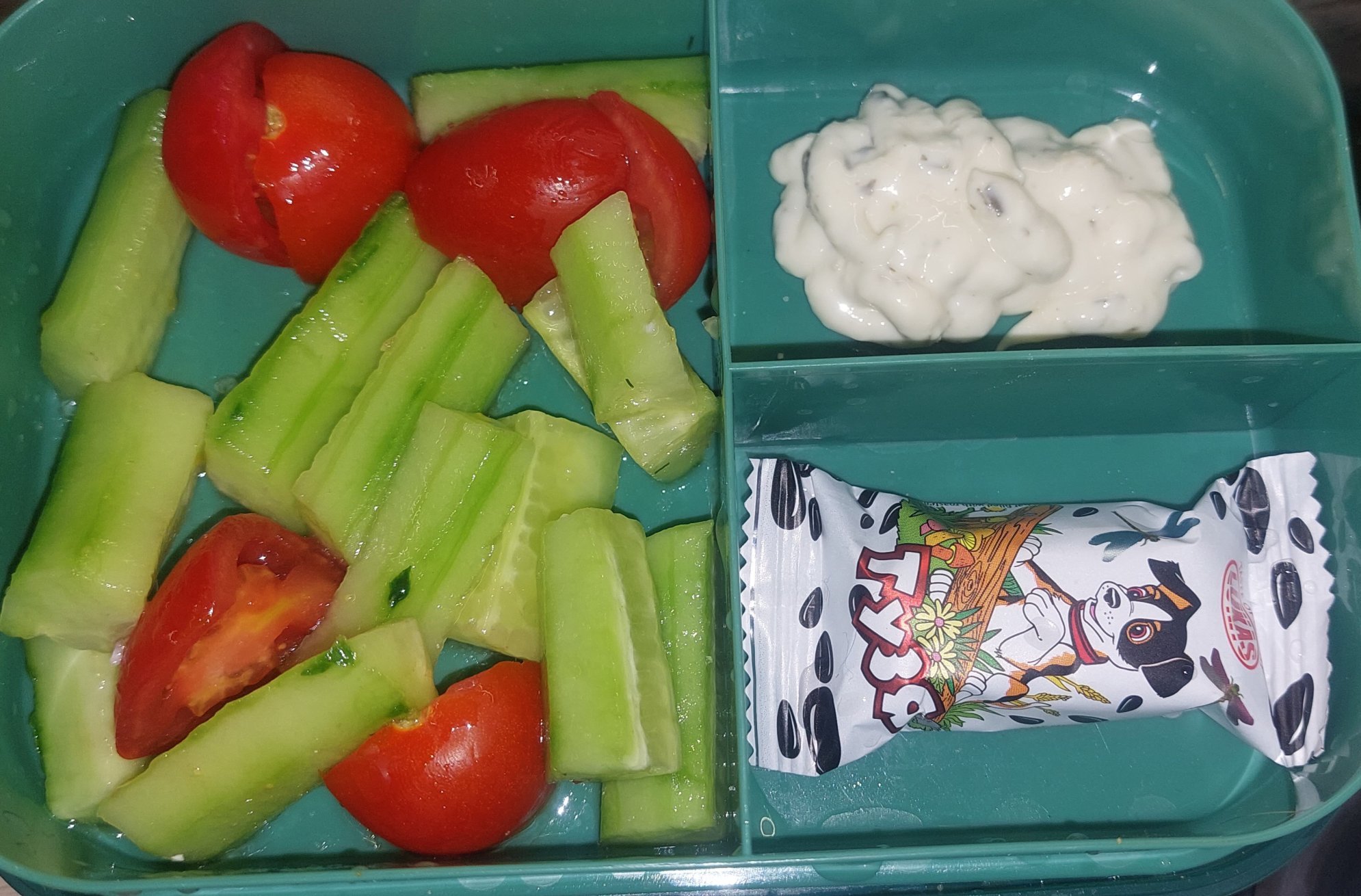 ,малко доматки ,краставици и ябълка отделно, и чернов сос за пицата.
