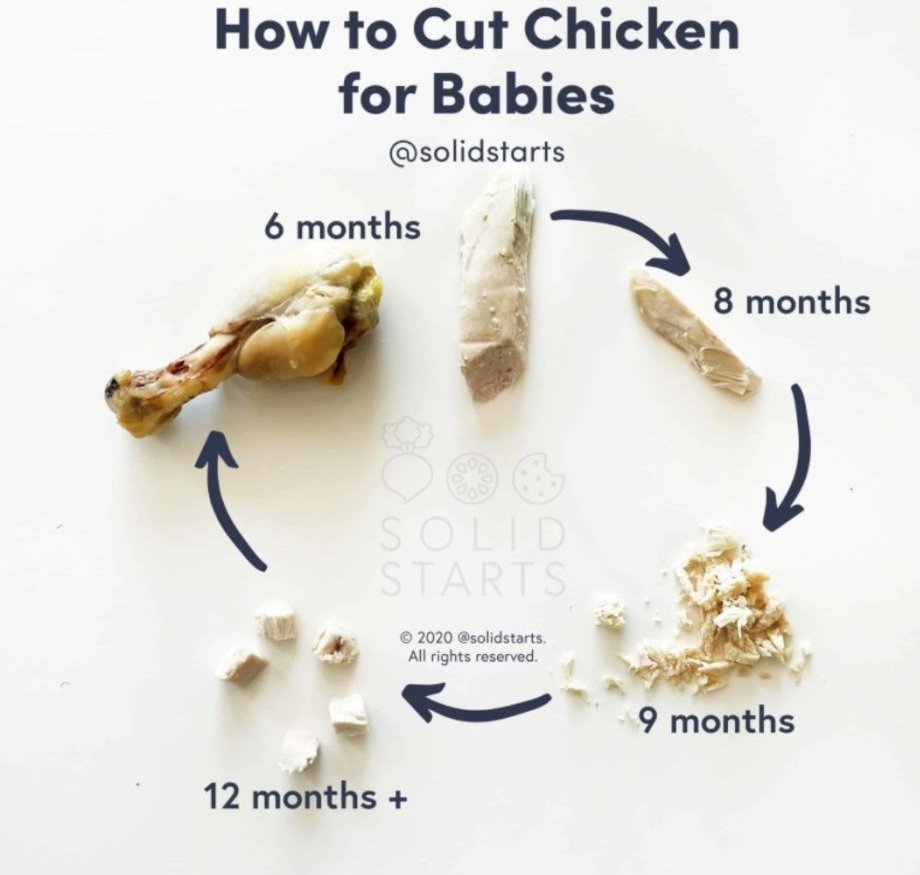 Според Solid starts пилешкото не е силен алерген и се дава от 6 месеца на кокъл. Месото, ако се готви бавно, става крехко и лесно за дъвкане. Вадят се само хрущялите, кожата и малката костица накрая, за да е безопасно. В смисъл в главата си не можех да си представя как ще сдъвче това месо, но след това в памперсите всичко беше смляно, явно се е справила. В интерес на истината даже не е гаг-вала.