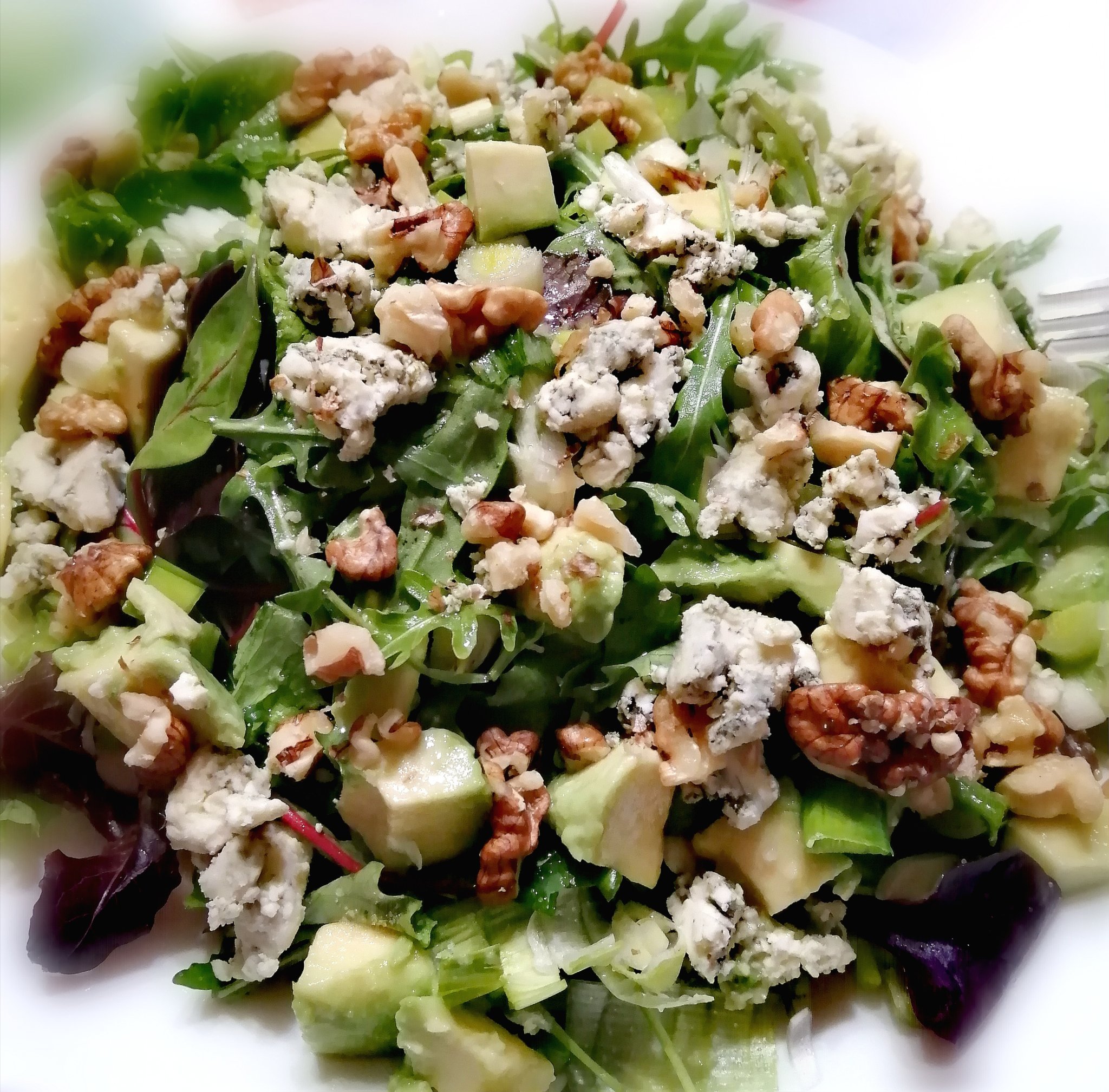 Аз се отчитам с една салата - микс от зелени салати, спанак, рукола, пресен лук и чесън, авокадо, синьо сирене и орехи с дресинг от зехтин, лимон и сол: