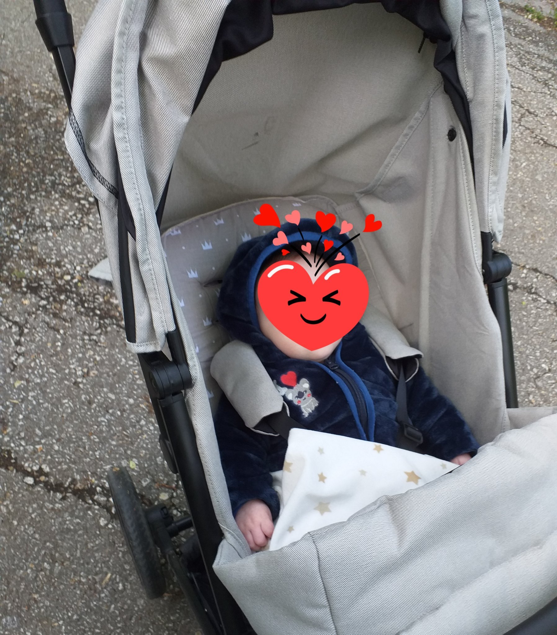 Дъщеря ни на 4 м в лятната количка. Прие количката супер лесно и се вози с кеф в нея. Тук е даже леко навдигната, защото искаше да гледа и постоянно стоеше на лакти, ако не я повдигна. Както меджу другото правеше и в кошът за новородено още преди да навърши 3 м.