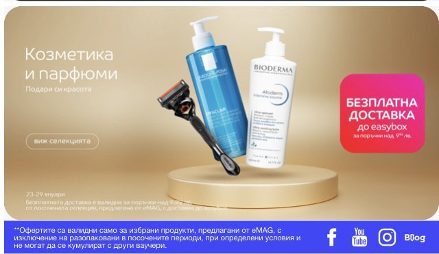 Безплатна доставка има в момента през приложението до Easybox ако в поръчката имате артикул от категория козметика и лична грижа за над 9.99 лв.