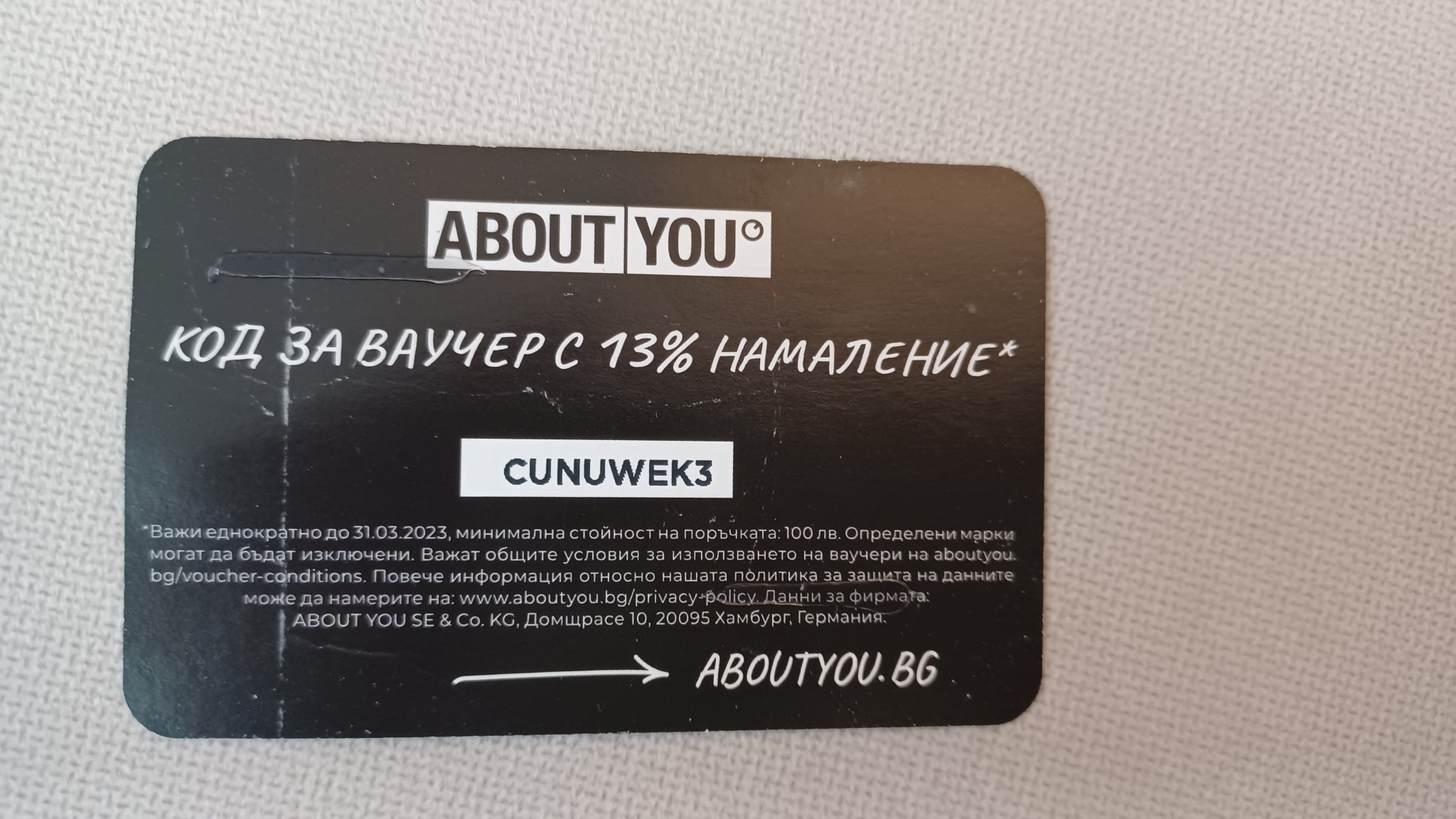 Здравейте. Имам два кода за about you с 13% отстъпка. Пишете ми лично съобщение.