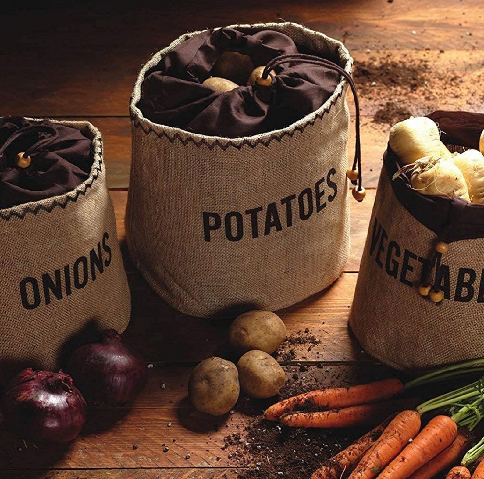 Най-различни са зеленчуковите торби, дишащи са и не запарват, някои са с ципче в долната част за да вадиш зеленчука и става ротация. На мен са ми удобни за лук и картофи, зелка понякога слагам там, карфиол, моркови ако взема повече.
