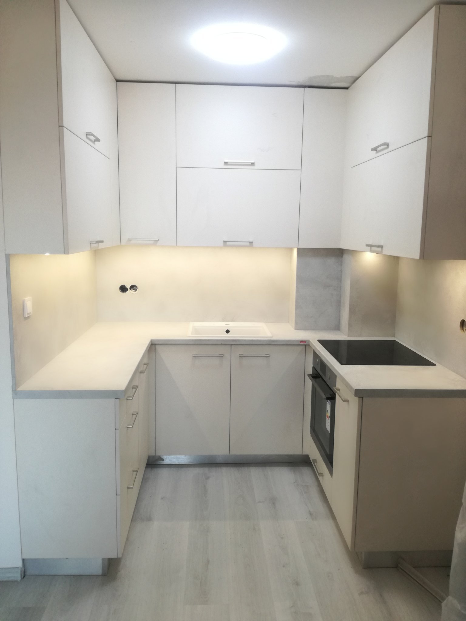 Хич не си врях носа, докато работеха майсторите, бяха много читави, затова и не знам с какво са свързани плота и гърба на кухнята, но те пък все ме викаха да ме питат и да ме мерят, особено в кухнята и банята.