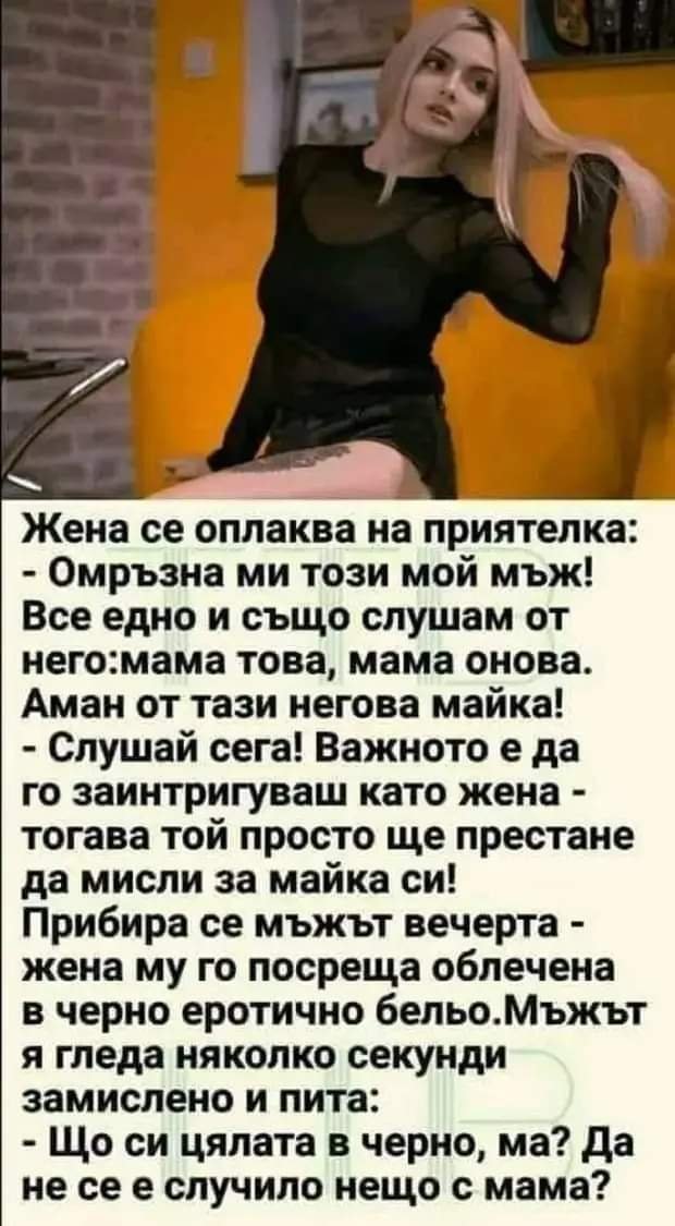 - Ми то и аз съм горе-долу така - всеки ден след работа при мен се качва бай Иван от втория етаж. Ядем каквото съм забъркала, пием каквото се намира, но после в леглото правим секс ...