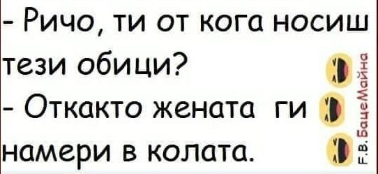 Снощи излязох с приятелки. Казах на мъжа ми, че ще се прибера точно в 12.00. Но беше много забавно с питиета, танци, още питиета. Забравих за часа. Оказа се че се прибрах в 3.00 сутринта напълно пияна. На влизане вкъщи часовникът с кукувицата изкука 3 пъти. Като си дадох сметка, че мъжът ми ще се събуди от кукането, изкуках с всички сили още девет пъти. Останах толкова доволна и горда от гениалната си идея! Заспах спокойно, мислейки колко интелигентна и умна съм. На сутринта мъжът ми ме попита в колко съм се прибрала и аз му казах в 12.00, както бях обещала. Помислих си "спасена съм", след което той каза: ? Между другото трябва да сменим часовника с кукувицата. - Така ли - казах аз трепереща...- и защо? ? Ами снощи не знам защо изкука три пъти и извика "еба си майката" и изкука още четири пъти, повърна в коридора, изкука още три пъти, спука се от смях и пак изкука, излезе тичайки, настъпи котката и счупи масата в хола, легна до мен, изкука още един път, пръдна и заспа.
