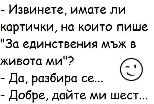 - Момичета, днес идва при мен един вежлив младеж, абсолютен симпатяга, облечен безупречно. Може само да си мечтаеш за такъв. Маркирам му покупките, а той ме е зяпнал. И изведнъж казва: