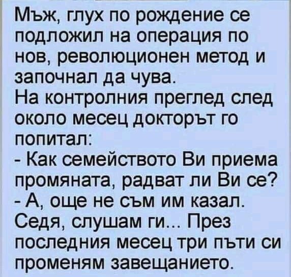 - Абе писна ми от женски оправдания да не правим секс - "Неразположена съм", "Боли ме главата", "Балдъза съм ти"....