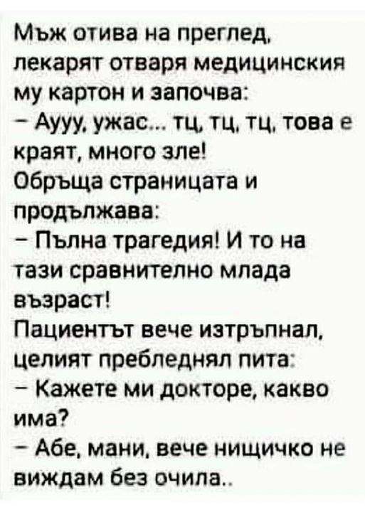 Един мъж не се чувствал добре и отишъл на лекар. Лекаря го прегледал и му казал, че състоянието му изобщо не е добро и трябва веднага да спре алкохола, цигарите и жените. Мъжа го погледнал жално и казал: