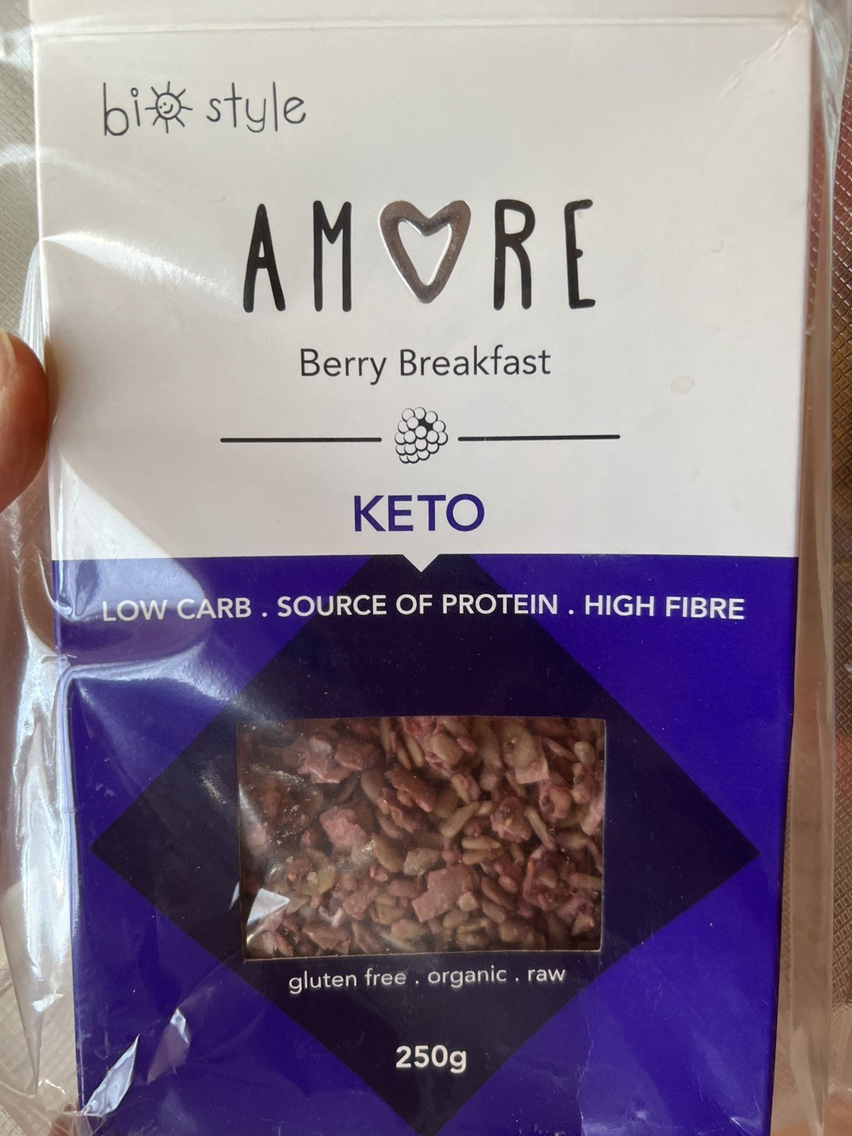 Една сладка закуска от мен- кисело мляко 10%, варено сладко от замразени берите с еритритол и ванилия, кето мюсли на Аморе, 2-3 ягоди и понякога слагам пекан.