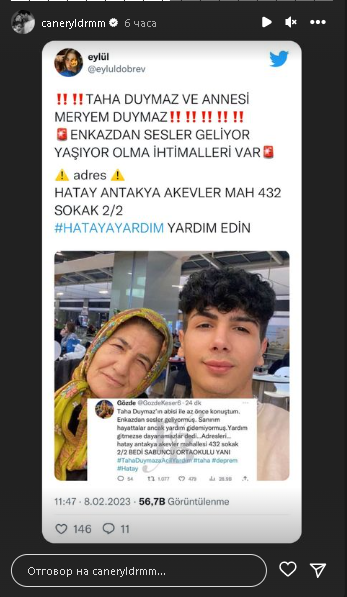 Мелис Бюрсин с апел за помощ на пострадалите от земетресението. Репостнала е и обръщението на брат си Керем.