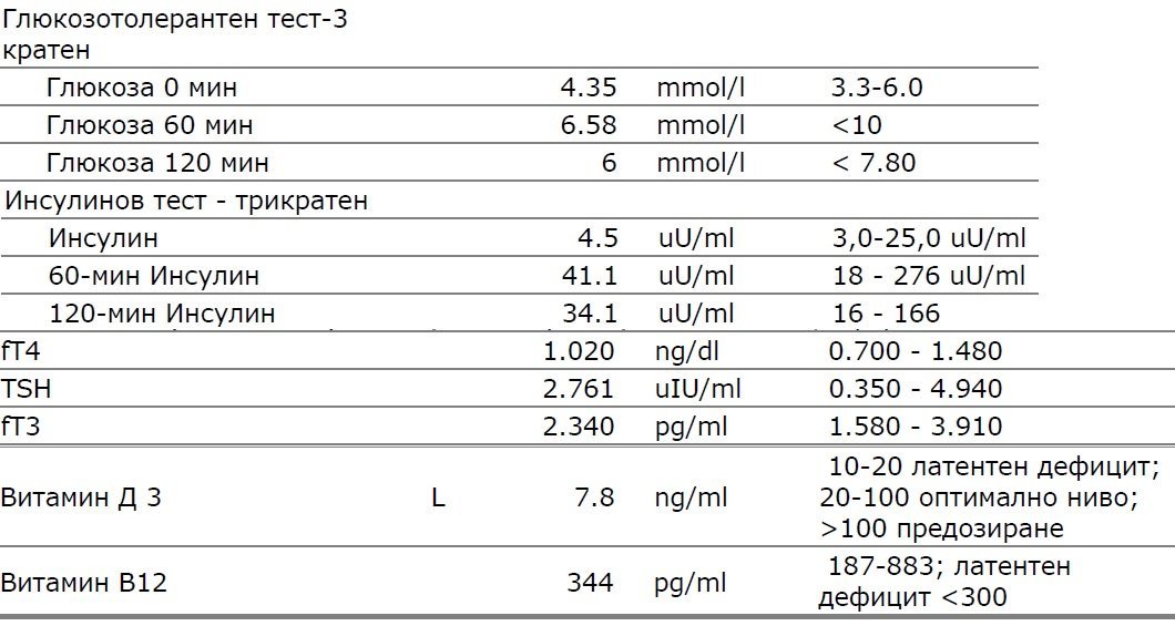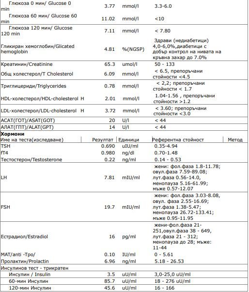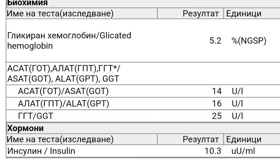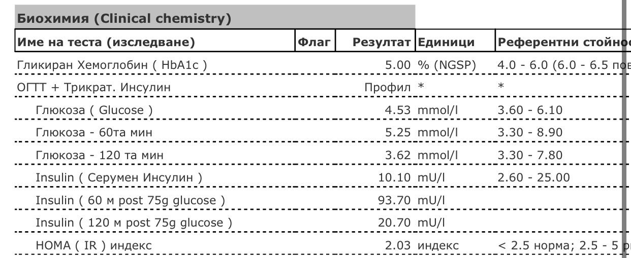 Здравейте, виждам, че в темата са обсъждани резултати на деца/подрастващи, та се обръщам за съвет! Накратко - момиче на 11год., рязко покачване на килограми и достигане на 60кг при височина 154 см. Първоначално го отдавах на следствие от травма, която преживя в края на 2022 - счупена подбедрица, операция с поставяне на титаниеви пирони, пълно обездвижване за 3 месеца, след което 2-3 месеца рехабилитация, физиотерапия и плавно приучване към ходене отново. Август месец - следваща операция за премахване на пироните. След преглед при детски ендокринолог и  назначени куп изследвания, основното и най-притеснително излезе КЗ 5,4 и инсулин 21,8 на гладно и доста завишени триглицериди. Направено е и натоварване, но резултатите са притеснителни дори и на гладно. Ендото назначи диета и след месец ново изследване и предписание за включване на Метфогама. Аз като човек, който от години се храни нисковъглехидратно и съм много добре запозната с принципите на здравословното хранене и го следвам без да имам здравословни проблеми, веднага приложих метода и в храненето на детето, въпреки диетата назначена от докторката (дори няма да я коментирам!). Изключих всички прости въглехидрати, източници на захар, вкл. плодове. Храни се основно със зеленчуци, сурови и задушени, протеин под формата на месо (пиле и пуешко), риба и яйца. Трудно е, не е по месото...опитвам да е разнообразно и вкусно. За 1,5 месеца е свалила 2 кг без гладуване, движим се колкото позволява графика ни (училище и работа от 7.00 до 18.00 Sad).