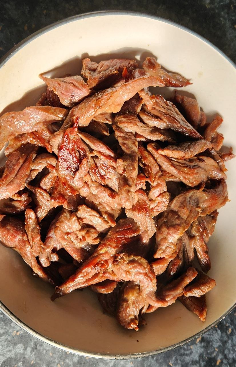 За телешкото - взимам крехко телешко без ципи - най-добре филе и го нарязвате на съвсем тъничко, поръсвате със сода за хляб една, две щипки/ в зависимост от количеството, оставяте настрана за минимум час, най-добре два. След което обърквате с 1-2 сл зехтин/олио и 1-2сл соев сос. В тиган на не висока / средно/температура пържите около 1-2 минути докато промени леко цвета си. В тигана не слагайте много месо.