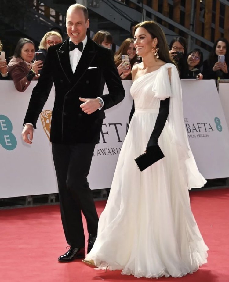 Кейт на наградите БАТФТА, повтаря роклята от 2019 според мен като само рамото е променено. Интересен избор са ръкавиците, обеците не ми харесват определено, прекалено кичозни за такава елегантна рокля.
