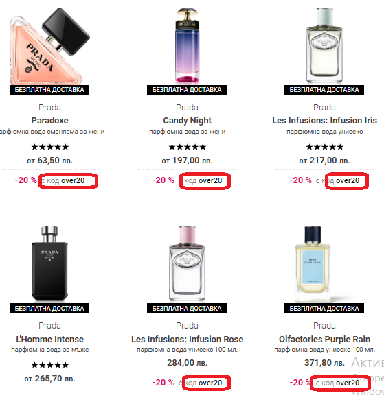 Оказва се, че кода over20 e приложим само за определени мл, не за всички разфасовки на конкретния парфюм. И като отвориш линка на парфюма, цъкаш да видиш кой от всичките е с този код.
