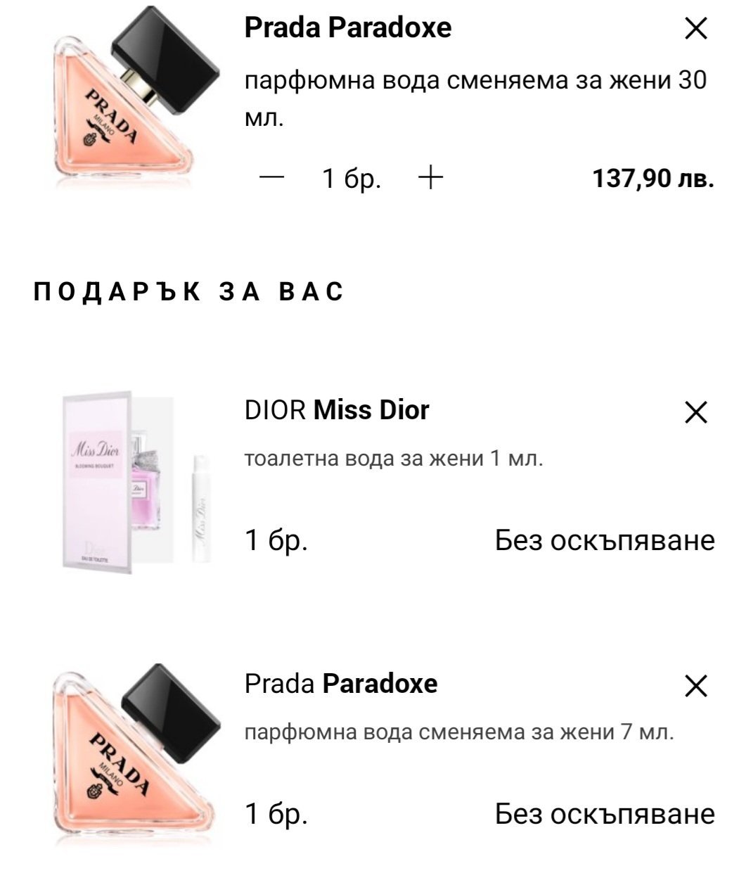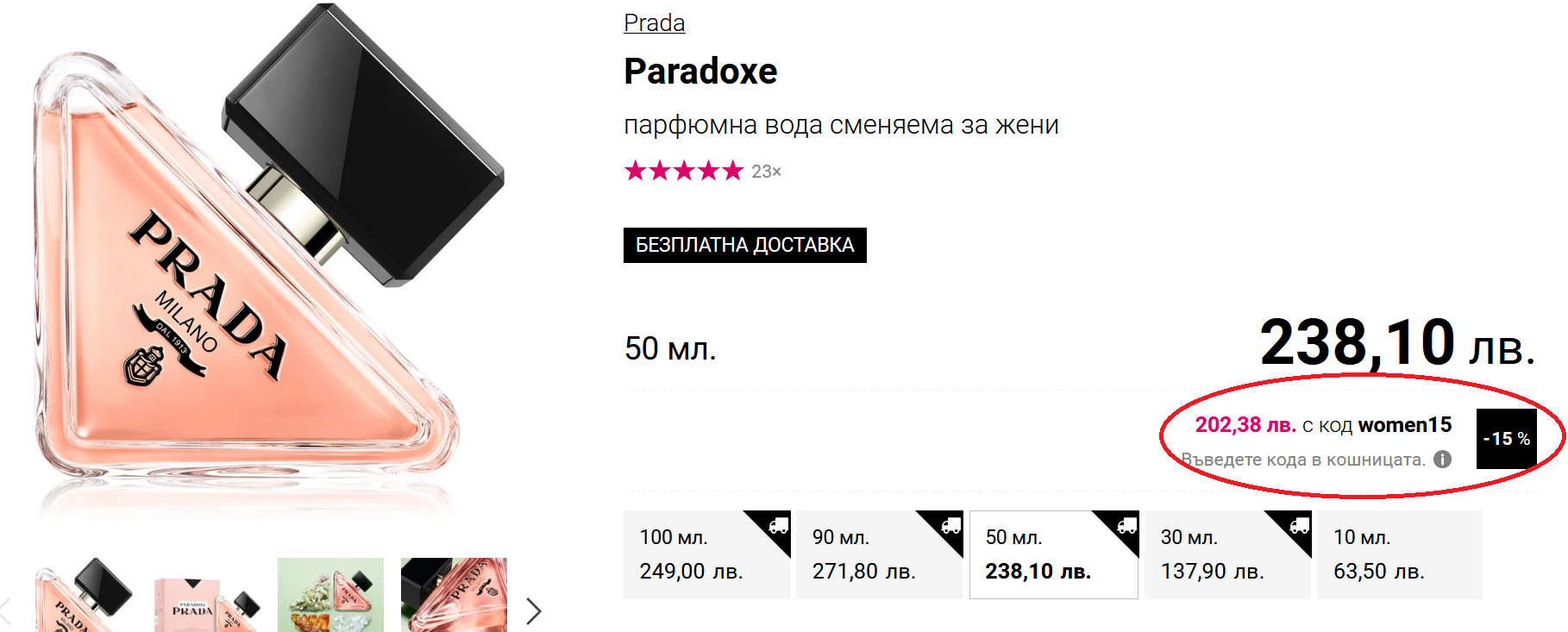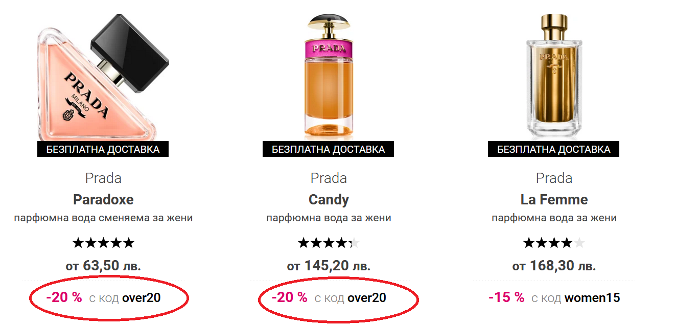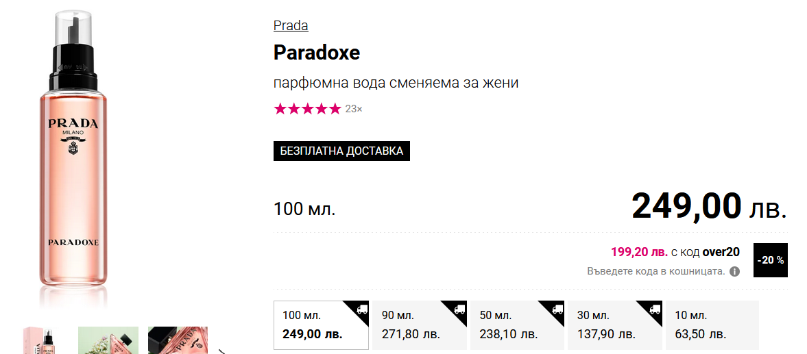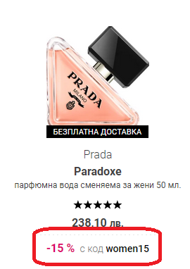 За 100мл Прада Paradox важи over20 , за другите мл само women15. При Прада Candy e само за 30мл...