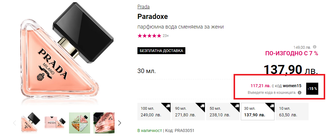 Прадата върви с два бонуса. С кода цената за 30 мл+7 е 113