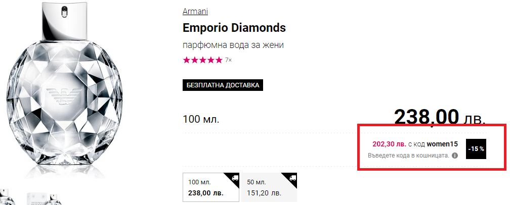 Сутринта поръчах козметика, която беше с 30% намалена, свалих още 15% с кода, мързеше ме да влизам в приложението, а и закъснявах за работа, но явно е била в секцията, в която я хваща отстъпката. Твоите парфюми явно не са в селекцията за кода.