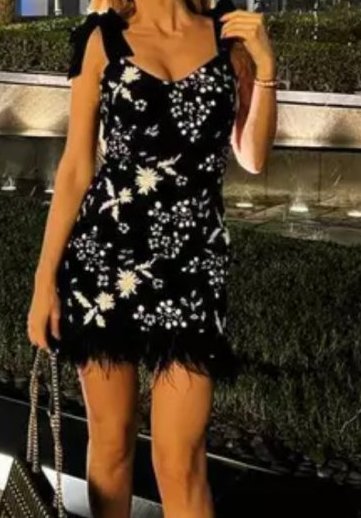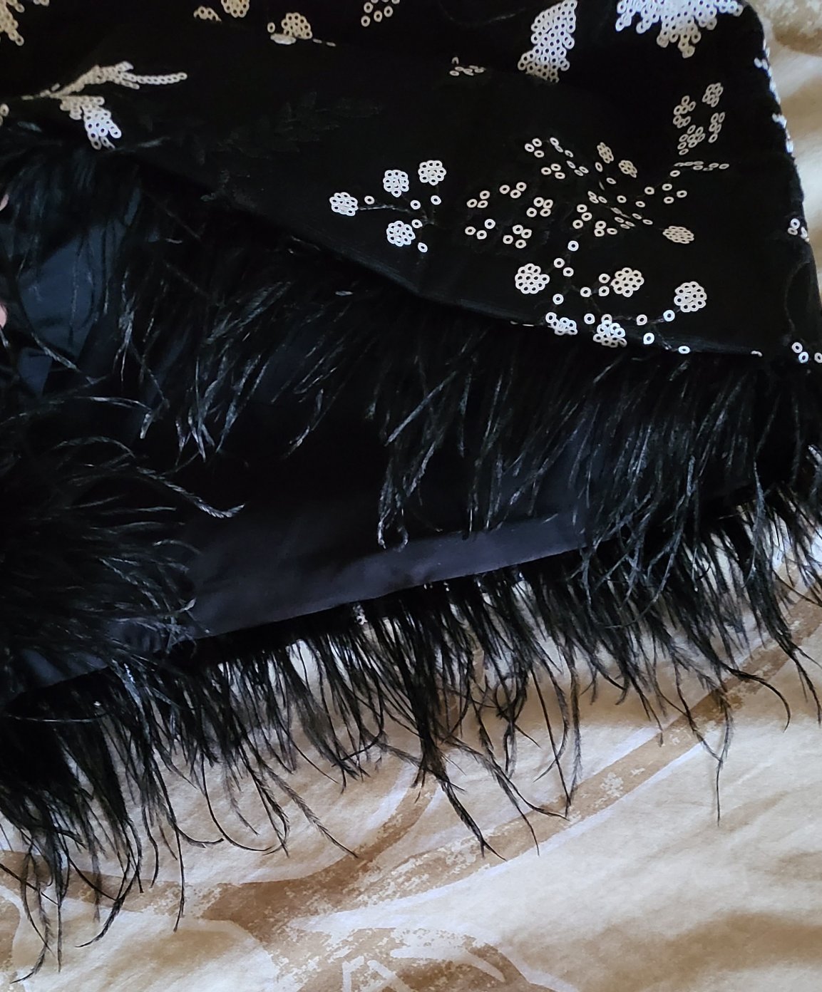 Черната рокля с перата в долния край, която беше намалена и тя с едни опърпани перца, облякох я, пипнах емблемата и тя се разши от едната страна. 🫣