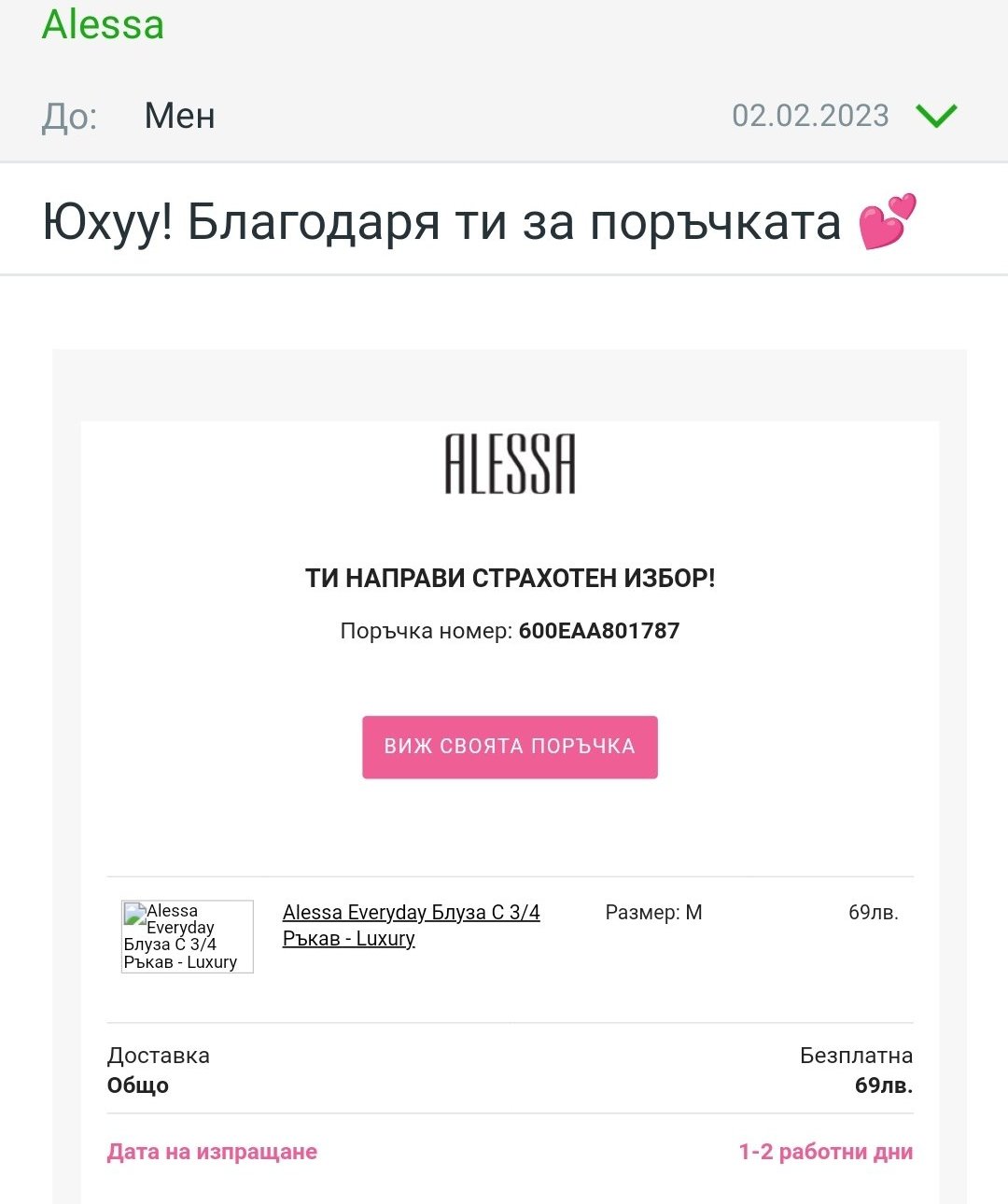 Привет, дами. Направих за първи път моята поръчка от Алеса, на 02 този месец. В имейла който ми изпратиха пишеше, че ще бъде изпратена до ден, два, но така и не получавам нищо. Писах им два имейла, отговор- никакъв. Вашите поръчки за колко време пристигат.