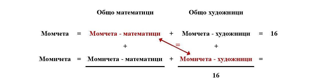 Момчета - ако са 9 художници и 7 математици, то момичетата художници ще са 7, т.е общо пак 16 художници.