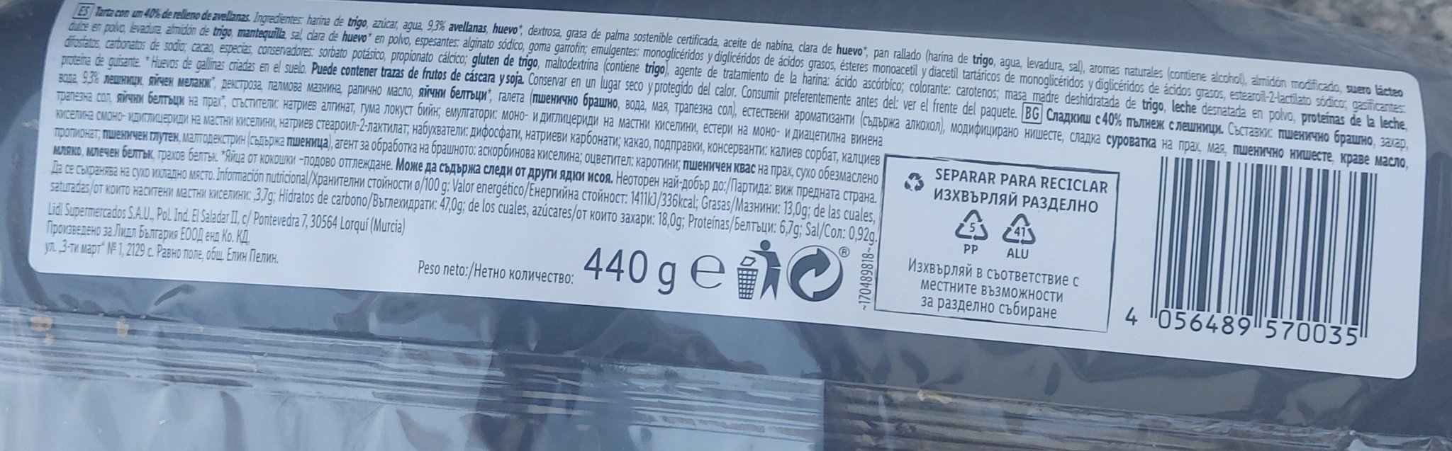 BG) Сладкиш с 40% пълнеж с лешници. Съставки: пшенично брашно, захар, 33. яйчен мелани", декстроза, палмова мазнина, рапично масло, яйчни белтъци", галета (пшенично брашно, вода, мая, трапезна сол), естествени ароматизанти съдържа алкохол), модифицирано нишесте, сладка суроватка на прах, мая, пшенично нишесте краве масло, на сол, яйчни белтъци на прах", състители: натриев алгинат, тума локуст бийн, емулгатори: моно- и диглицериди на мастни киселини, естери на моно- и диацетилна винена киселина моно-дилицериди на мастни киселини, натриев стеароил-2-лактилат, набухватели: дифосфати, натриеви карбонати, какао, подправки, консерванти: калиев сорбат, калциев