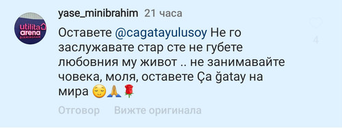Гледах снимки на новата . Накратко, тя има стил. Тя изглежда добре. Трябва да се има предвид, че това са актьори - те имат всичко като не обикновените хора. Те са от съвсем друга планета. Имат нужда от нови усещания, преживявания. Така че те сами търсят нови жени или дами, които да ходят под тях.  Радвам се,че Чаатай най-после се измъкна от дупката си .Иначе сме като сирачета..други актьори непрекъснато се рекламират..