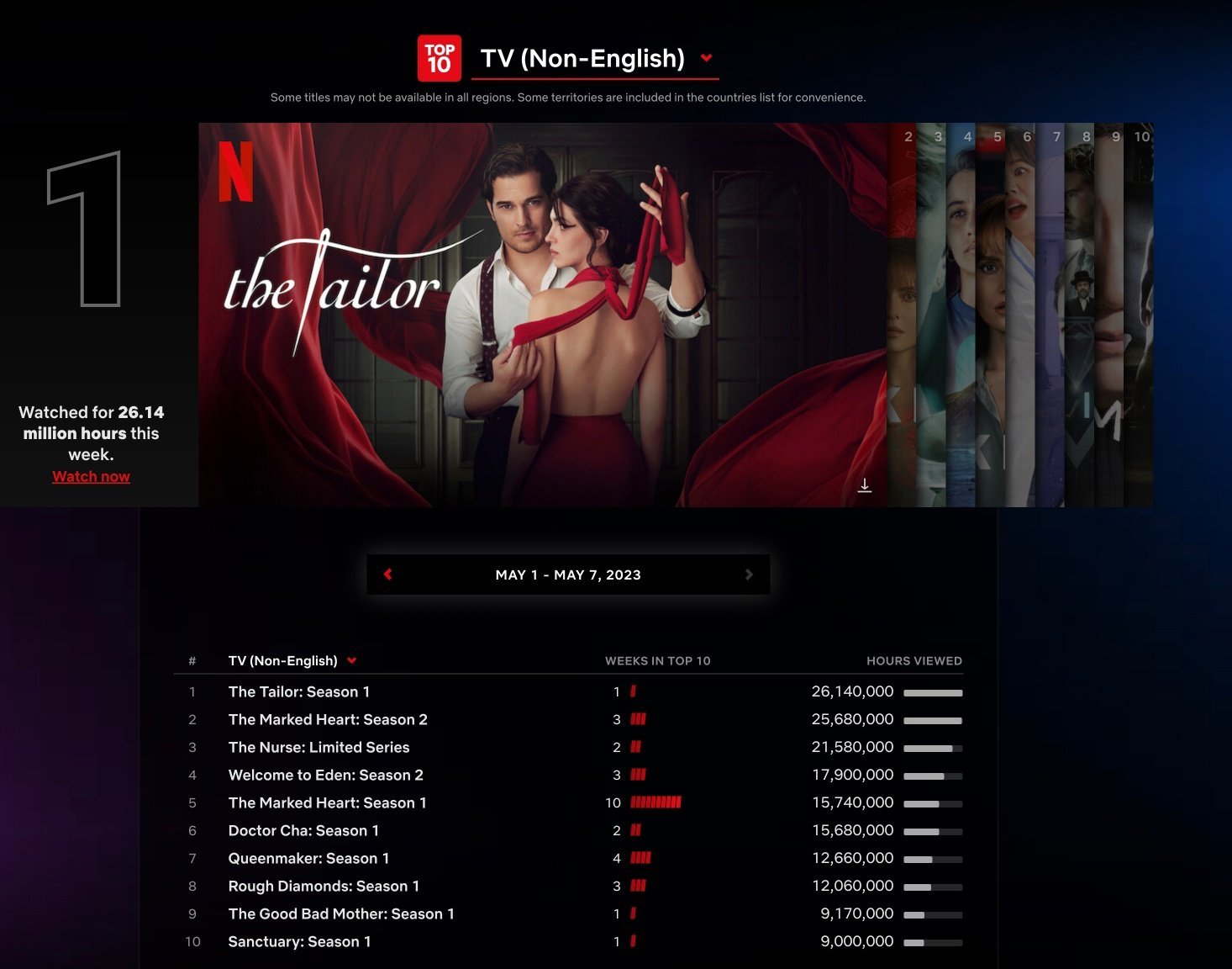 🔥 Според официалната информация на дигиталната платформа Netflix сериалът "Шивачът" е гледан от 26 милиона 140 хиляди часа, стартирайки на 1-во място сред всички неанглоезични сериали на платформата в света. Картината беше на върха в 62 страни по света. Сериалът беше шестият в топ от всички сериали на Netflix в света (включително англоезичните). Това е най-добрият старт сред турските сериали, за които имаме официална информация