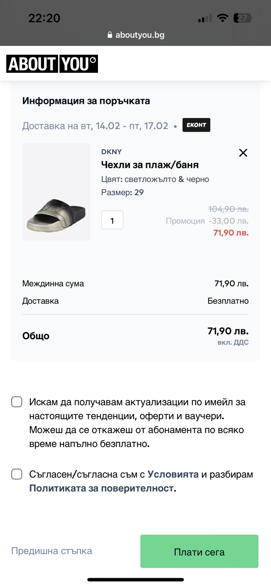 За да върнете продукт към AboutYou, трябва да използвате предоставения документ за връщане, който ще намерите в опаковката. Включете артикулите, документа за връщане и залепете етикета (товаритеница). След това можете да предадете пратката в офис на Еконт или да поръчате куриерска услуга до вашия адрес.