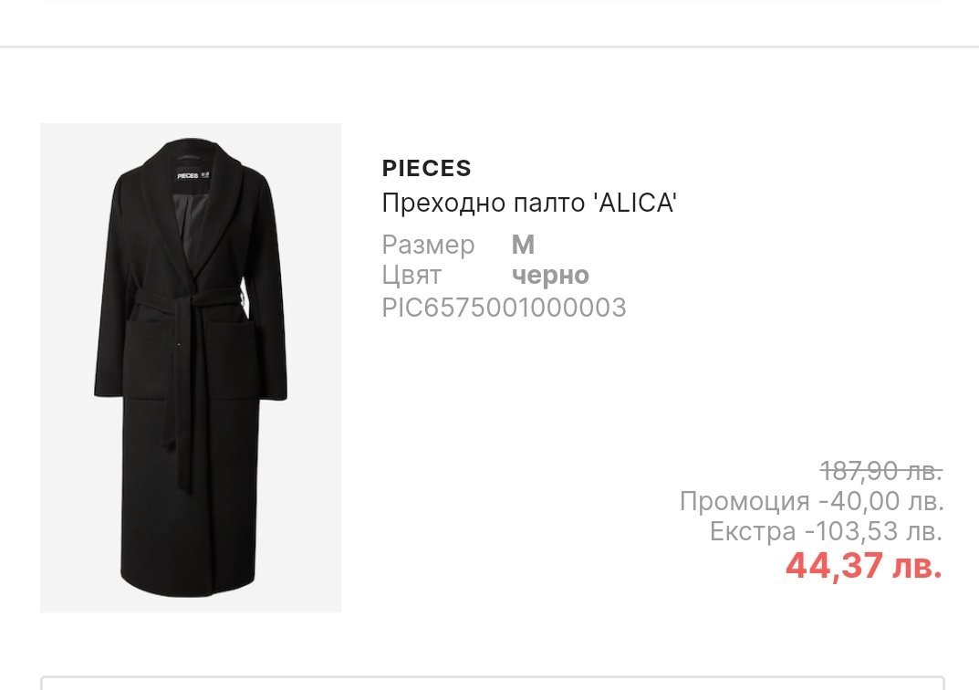 Днес получих това палто. Поръчах последен брой, размер М. По принцип поръчвам Л, но го мернах за тази цена и реших да рискувам. Добре ми е като размер, харесва ми. Има 10% вълна. Не ми допада, че няма никакви копчета, само колан. Стои елегантно, става за ранна пролет. С две думи- за тази цена е идеално.